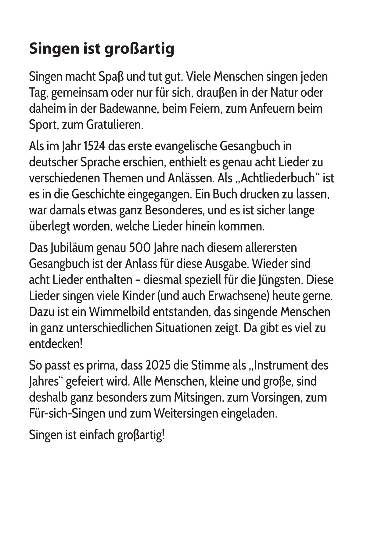 Das AchtKINDERliederbuch richtet sich an Kinder vom Kita- bis zum Grundschulalter. Es beinhaltet acht geistliche Lieder zu verschiedenen Themen – genau wie im Achtliederbuch von 1524, dem allerersten evangelischen Gesangbuch. Die Lieder treffen Alltags- und Lebensmomente von Kindern und Familien (z.B. Schlafen, Essen, Feiern, Schöpfung, Segen) und sollen das gemeinsame Singen dort, in der Familie, anregen.