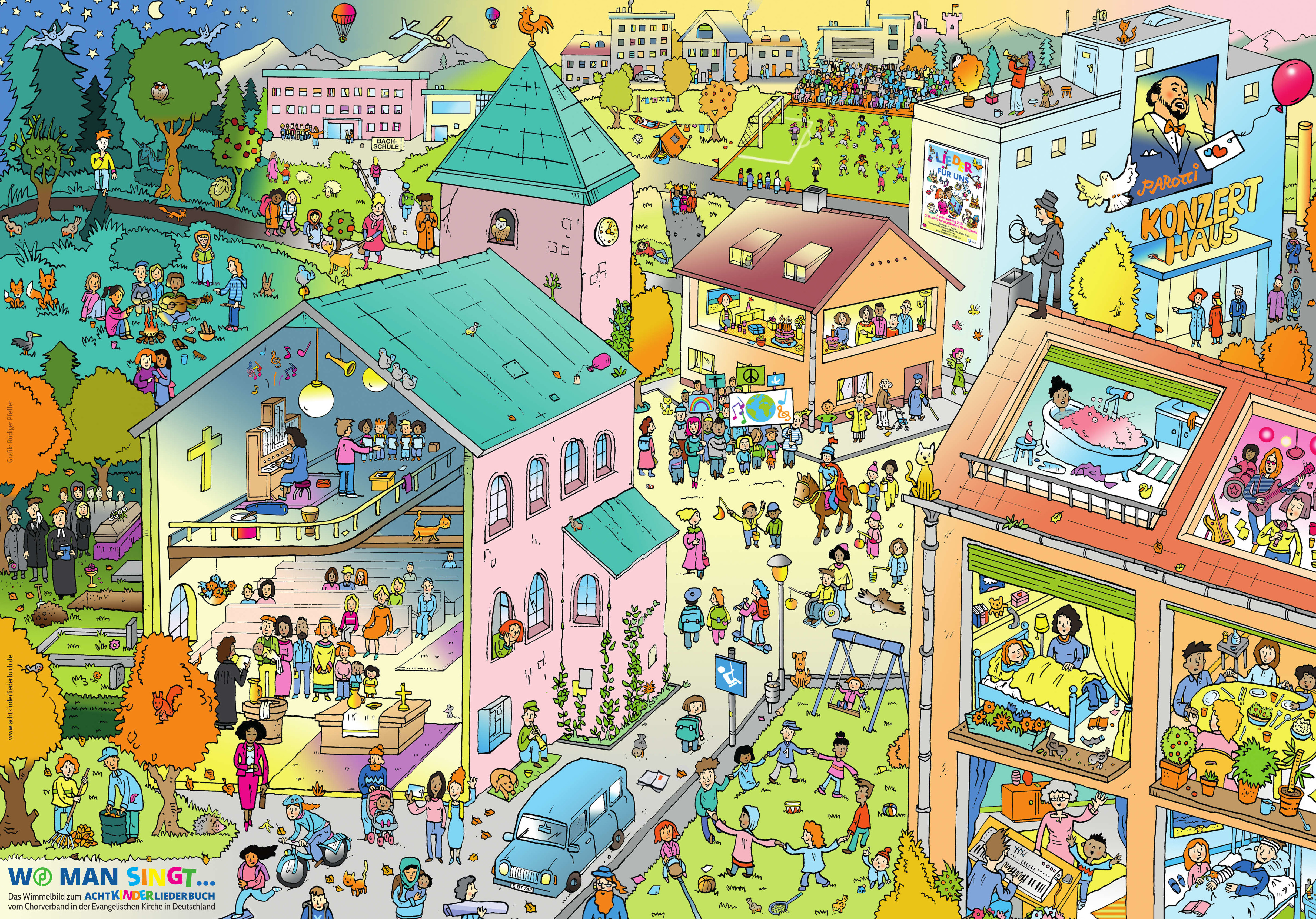 Der Chorverband in der Evangelischen Kirche in Deutschland hat in diesem schön illustrierten Liederheft die acht beliebtesten christlichen Kinderlieder zusammengestellt. Ergänzend dazu enthält das Heft ein liebevoll gezeichnetes Wimmelbild von Rüdiger Pfeffer als A3-Plakat fürs Kinderzimmer: es zeigt Alltagssituationen, in denen Kinder (und Erwachsene) singen.