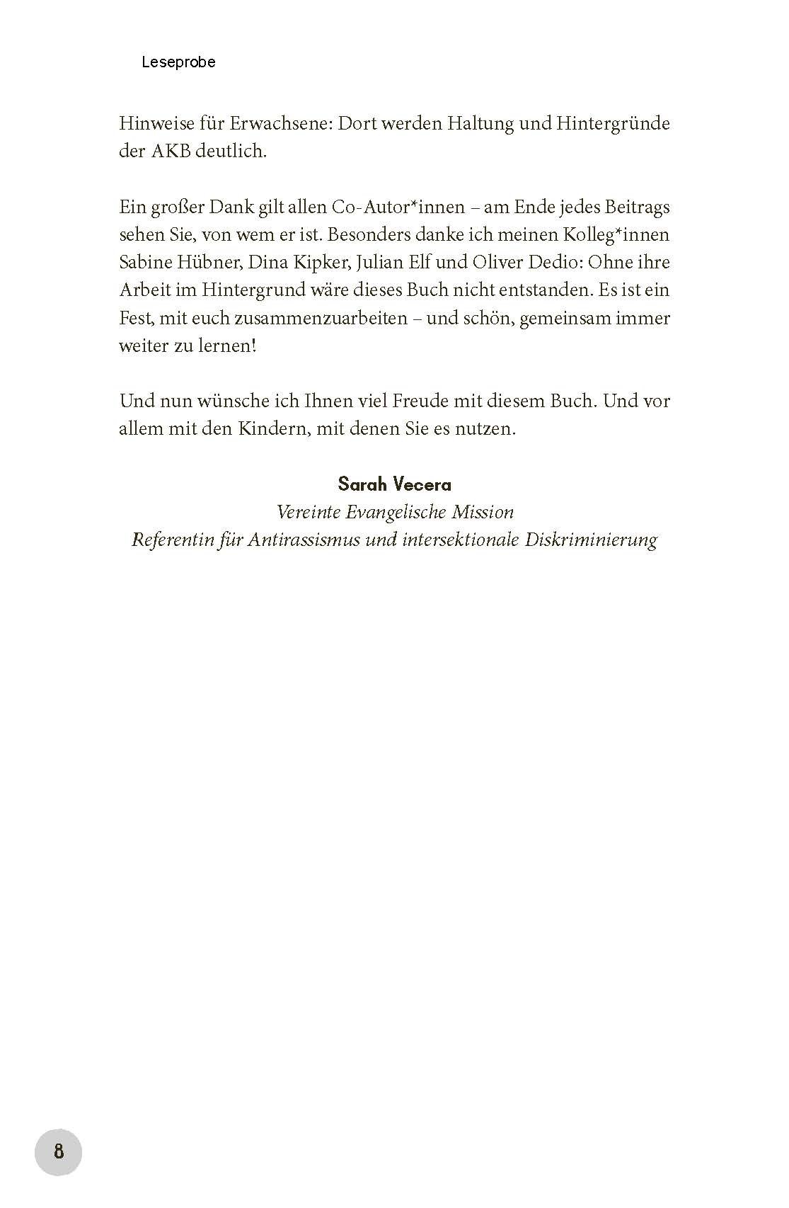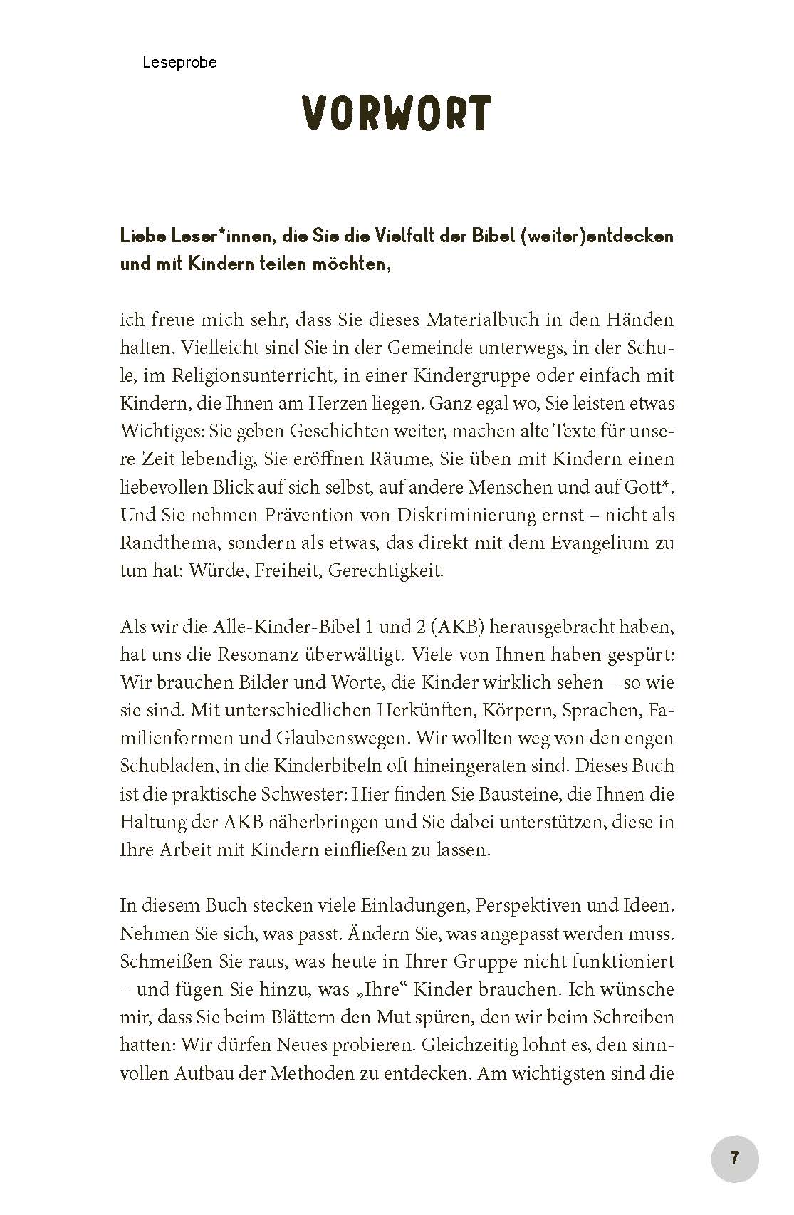 Sarah Vecera eröffnet das Buch mit einem Vorwort, das die Grundhaltung der Alle Kinder Bibel unterstreicht: Glaube als gute Nachricht für alle, sensibel für Sprache, Perspektiven und Lebensrealitäten von Kindern heute.