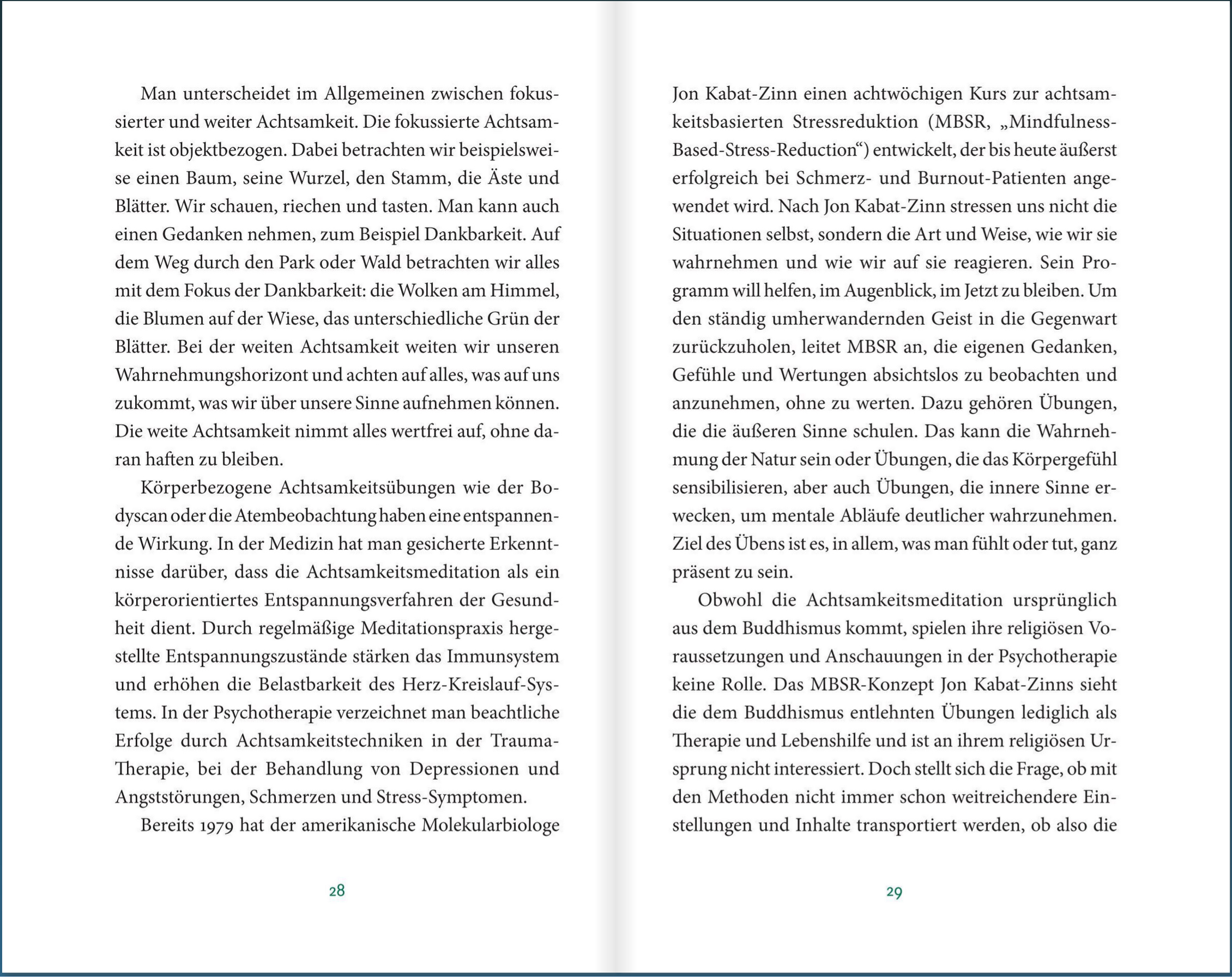 Die Übungen sind zeitlich flexibel: von 5 Minuten (Sinnesübung) bis zu 45 Minuten (Achtsamkeitswanderung). Viele Impulse lassen sich auch als Mini‑Rituale für unterwegs verwenden.