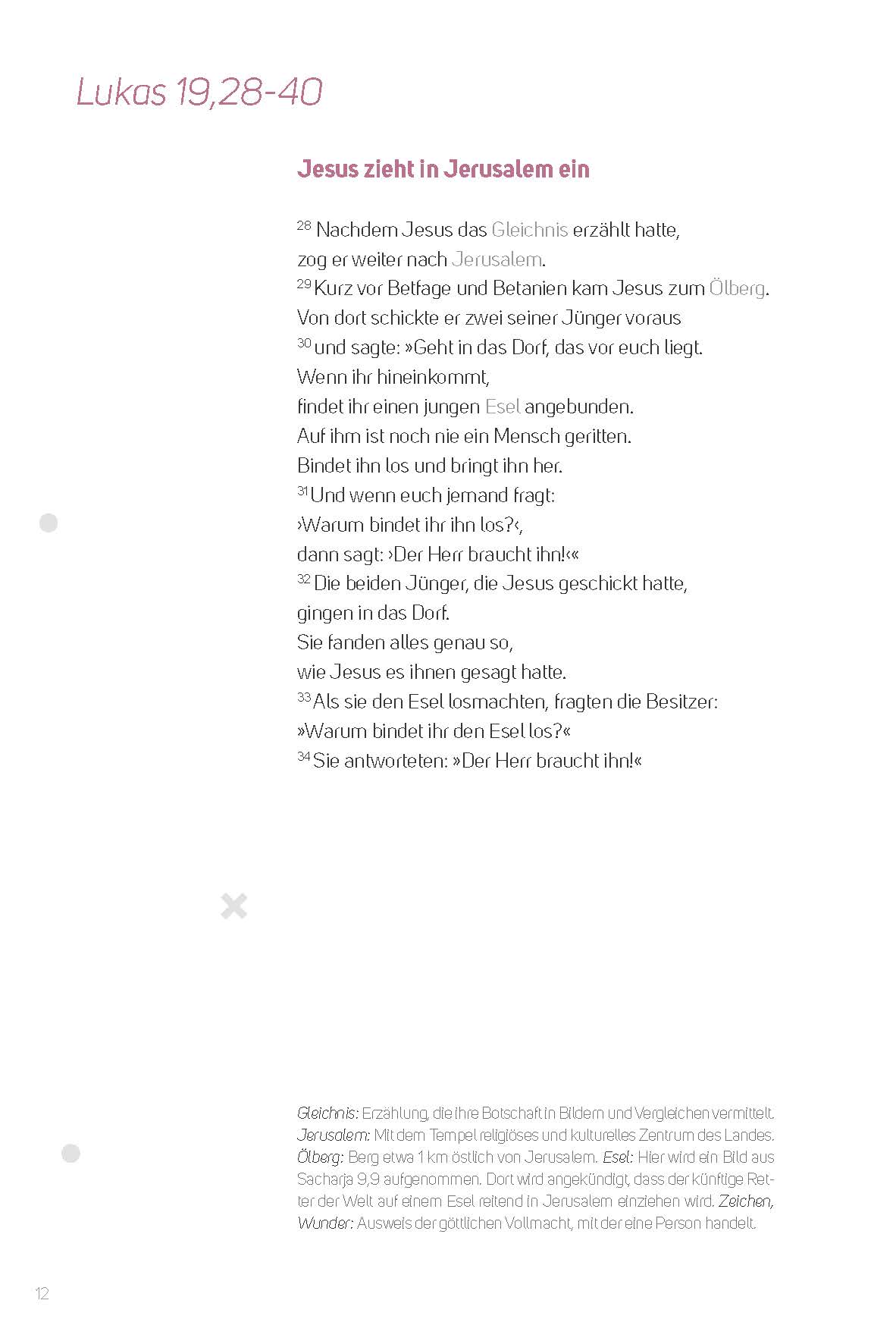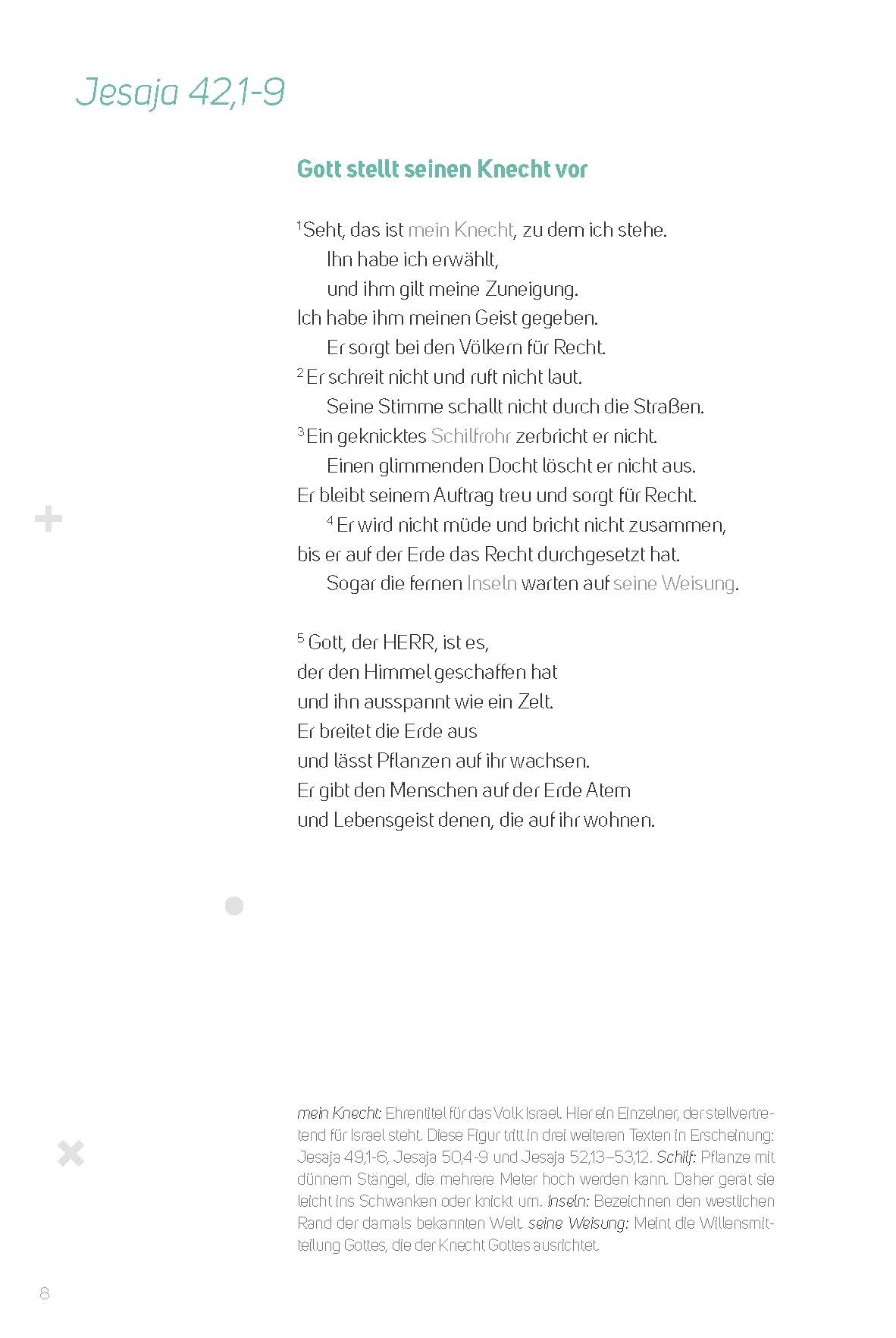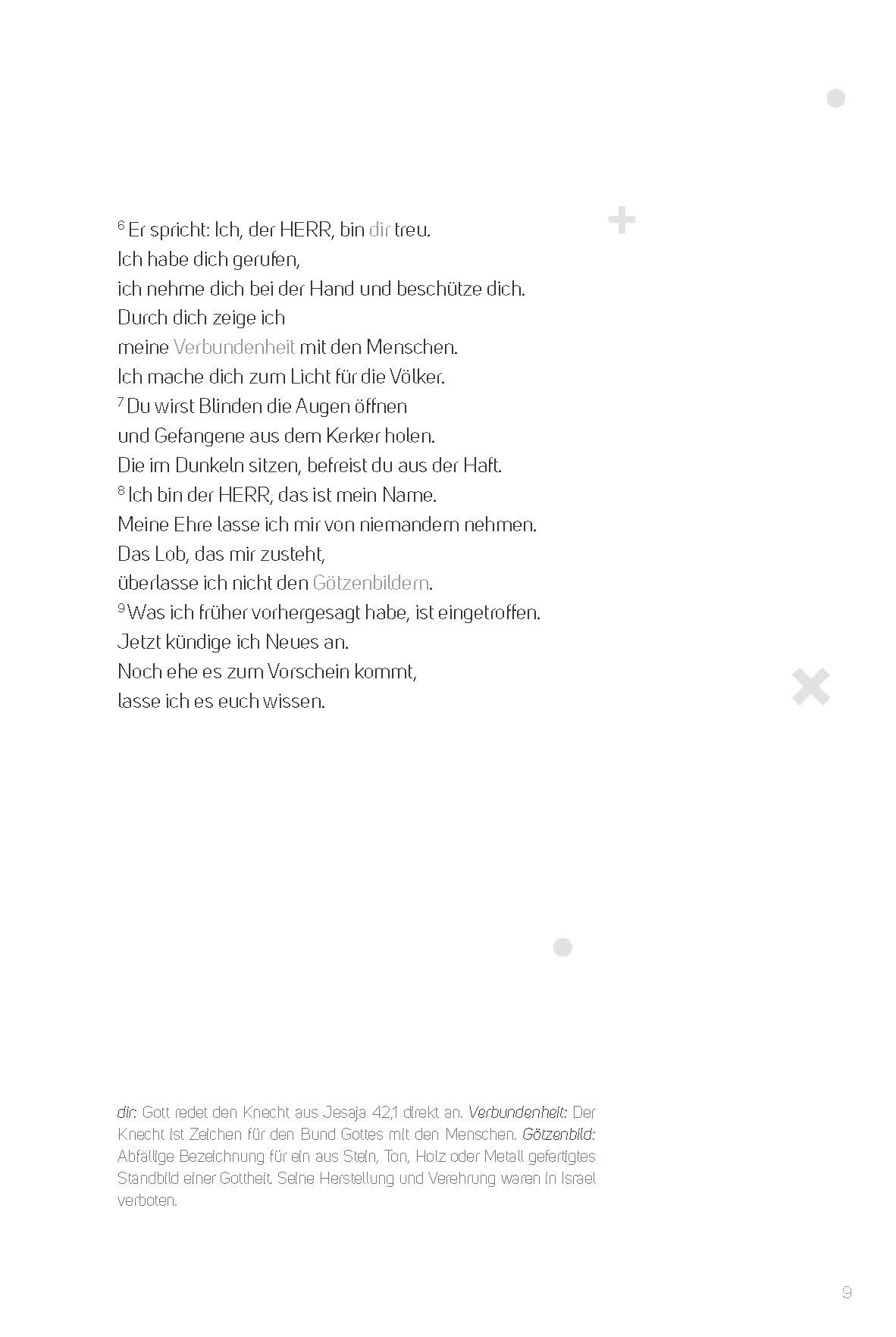 Neben Auszügen aus dem Lukas-, Johannes- sowie dem Markusevangelium sind auch Texte aus den Psalmen und den Prophetenbüchern enthalten.