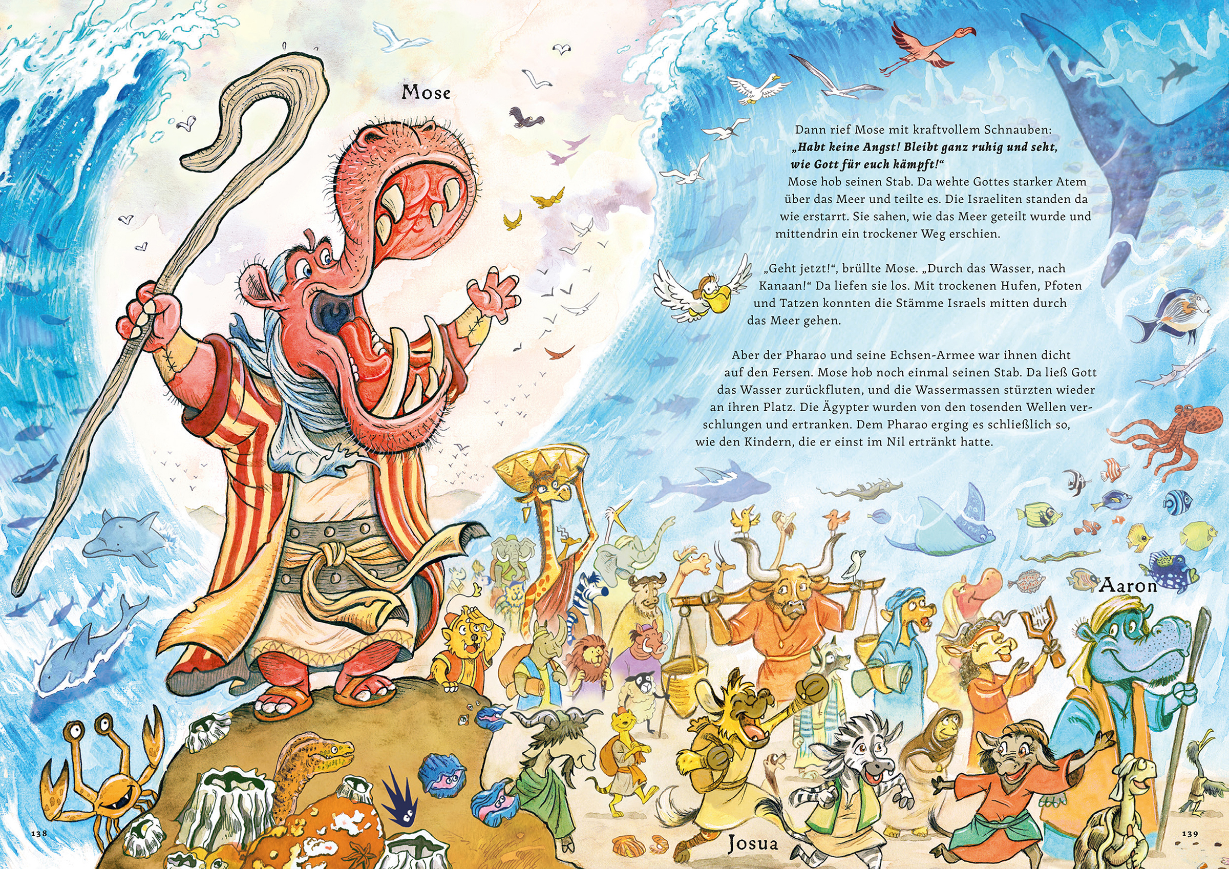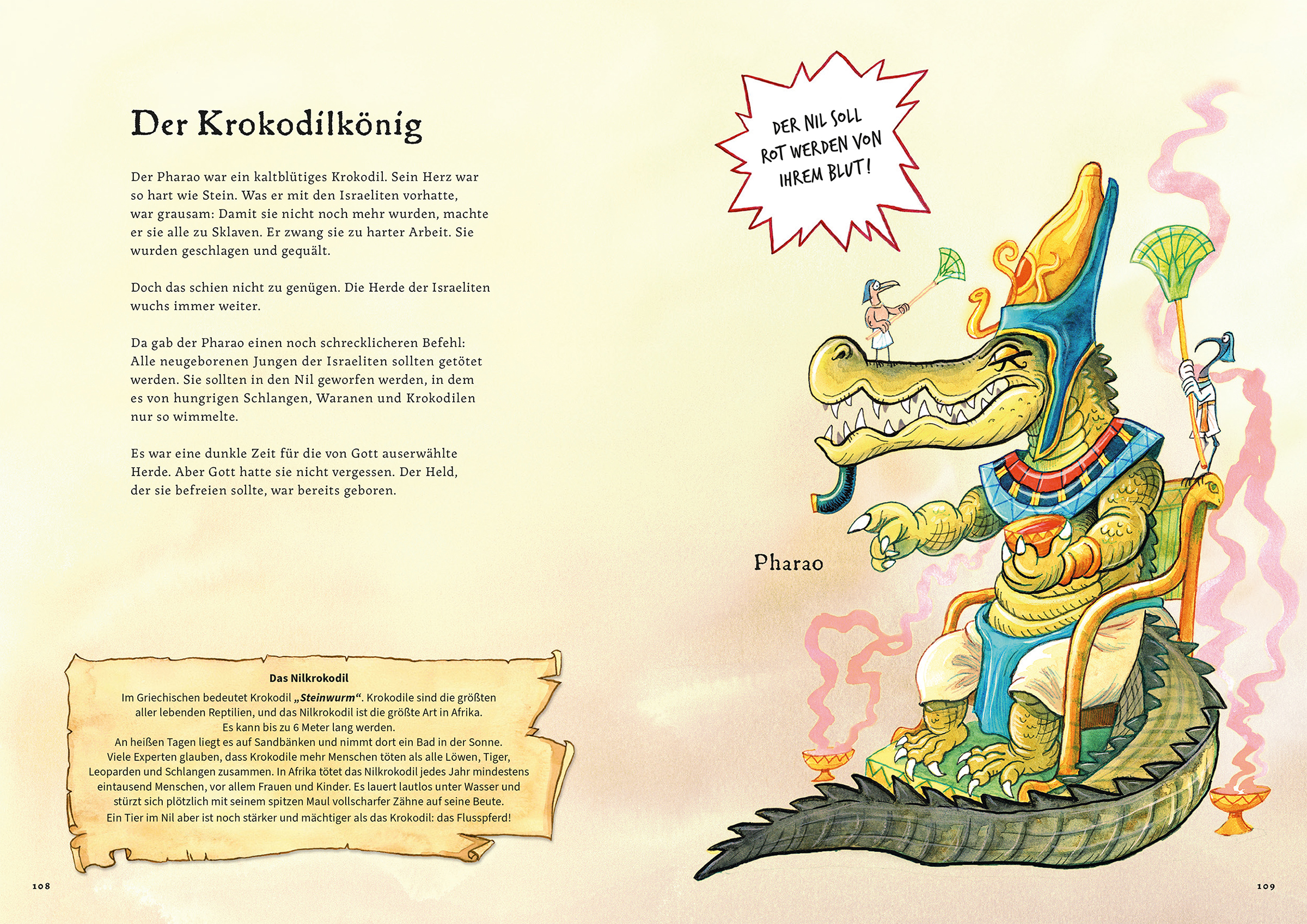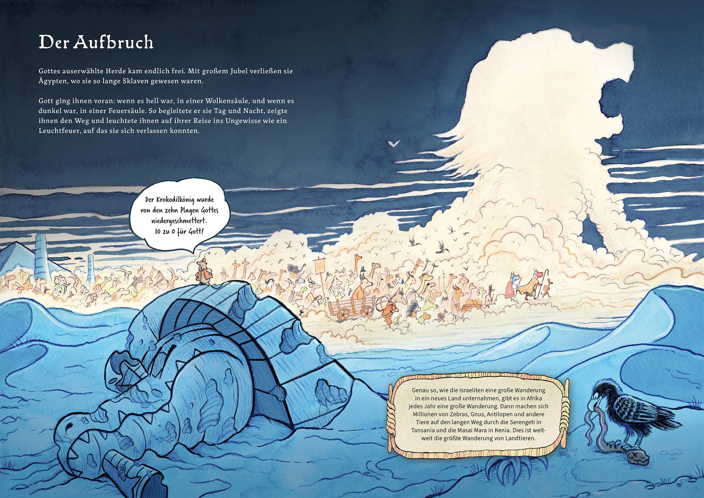 Das Heft Der große Aufbruch erzählt die biblische Geschichte von Nilpferd Mose: Als Baby entkommt er nur knapp dem Tod und wird von der Tochter des mächtigen Herrschers Pharao aufgezogen. Schließlich wird er zum Anführer, streitet mit Gottes Hilfe gegen Krokodil Pharao und führt Gottes Herde aus Ägypten in die Freiheit.