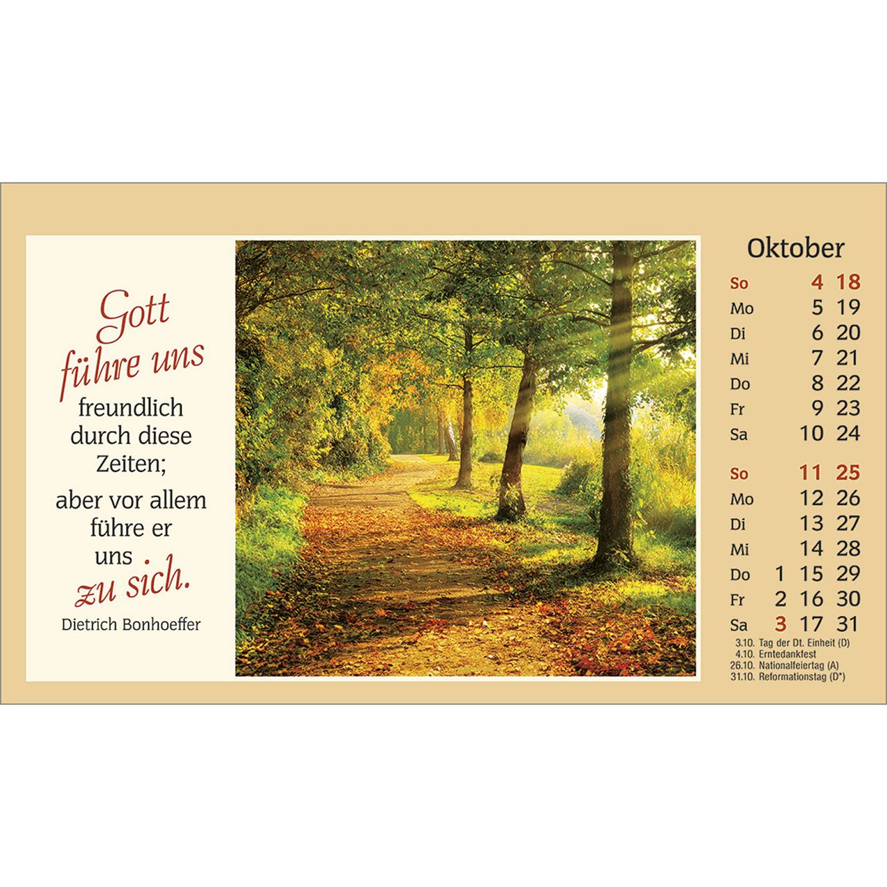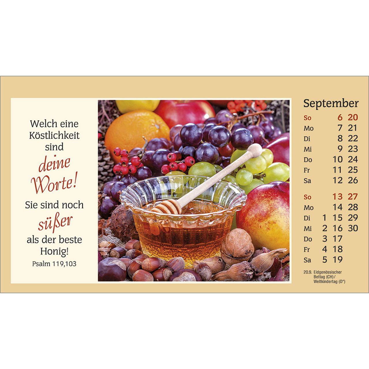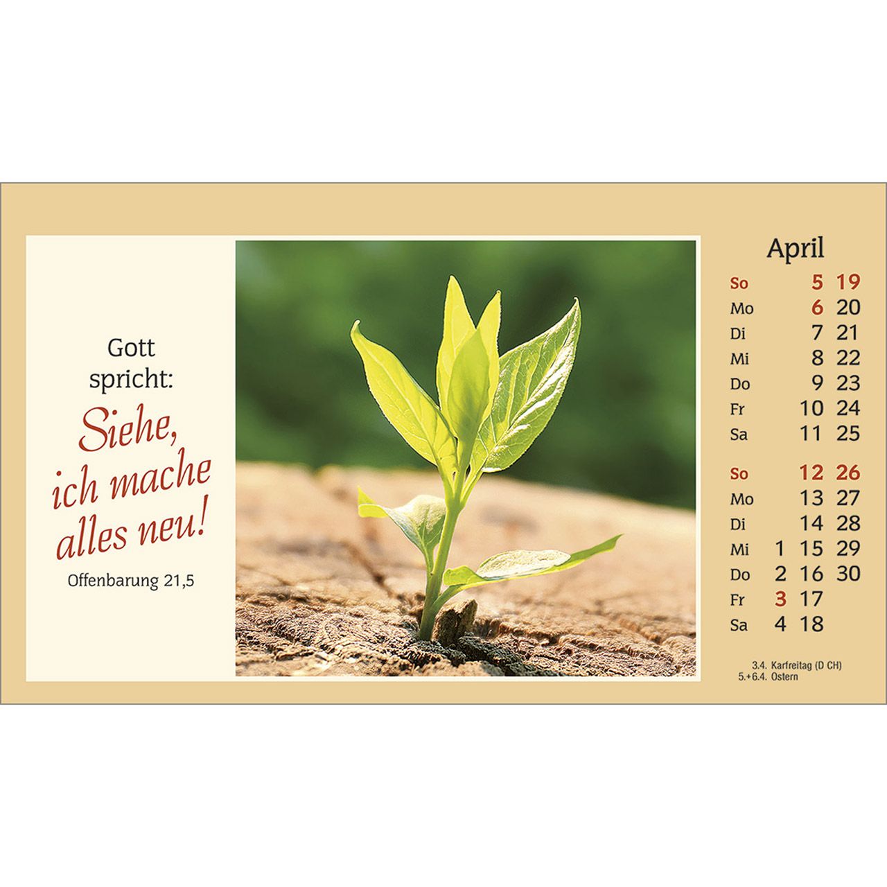 Der Kalender verbindet Bild und Wort: Jede Monatsseite enthält vier stimmige Fotografien sowie vier prägnante Andachten oder Impulse, die sich gut als Wochen- oder Tagesgedanke eignen. Das Kalendarium ist als Wochenkalender angelegt und bietet Raum für kurze Notizen, Gebetsanliegen und persönliche Erinnerungen.