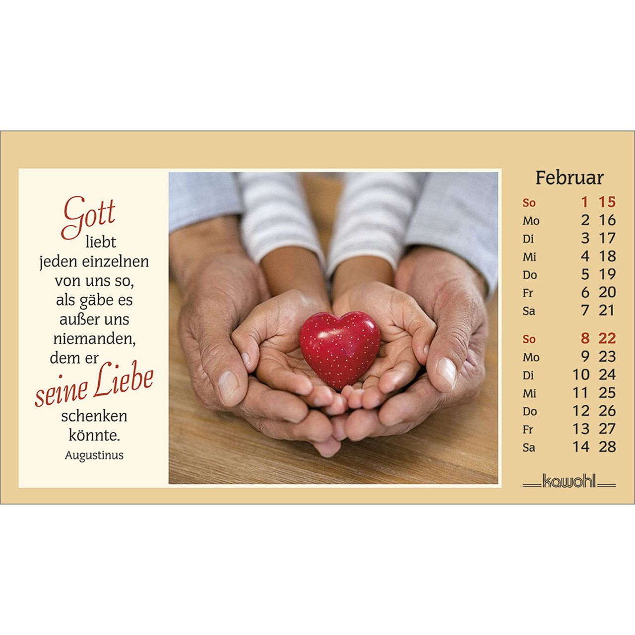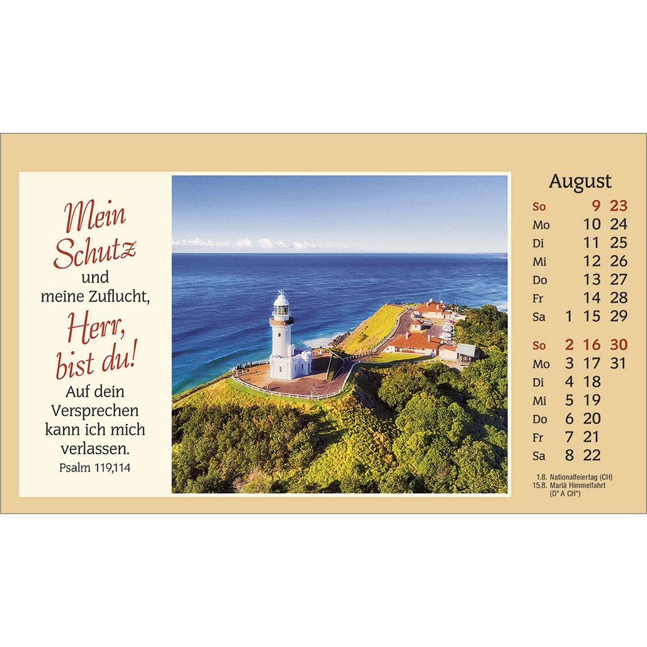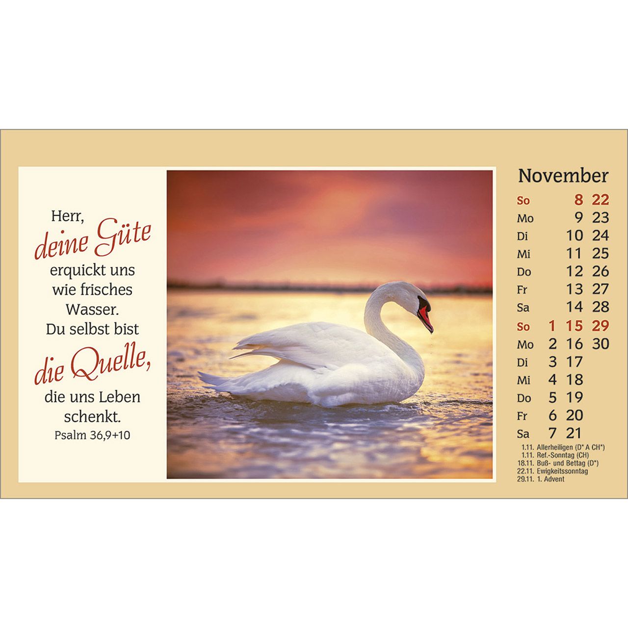 Der Kalender verbindet Bild und Wort: Jede Monatsseite enthält vier stimmige Fotografien sowie vier prägnante Andachten oder Impulse, die sich gut als Wochen- oder Tagesgedanke eignen. Das Kalendarium ist als Wochenkalender angelegt und bietet Raum für kurze Notizen, Gebetsanliegen und persönliche Erinnerungen.