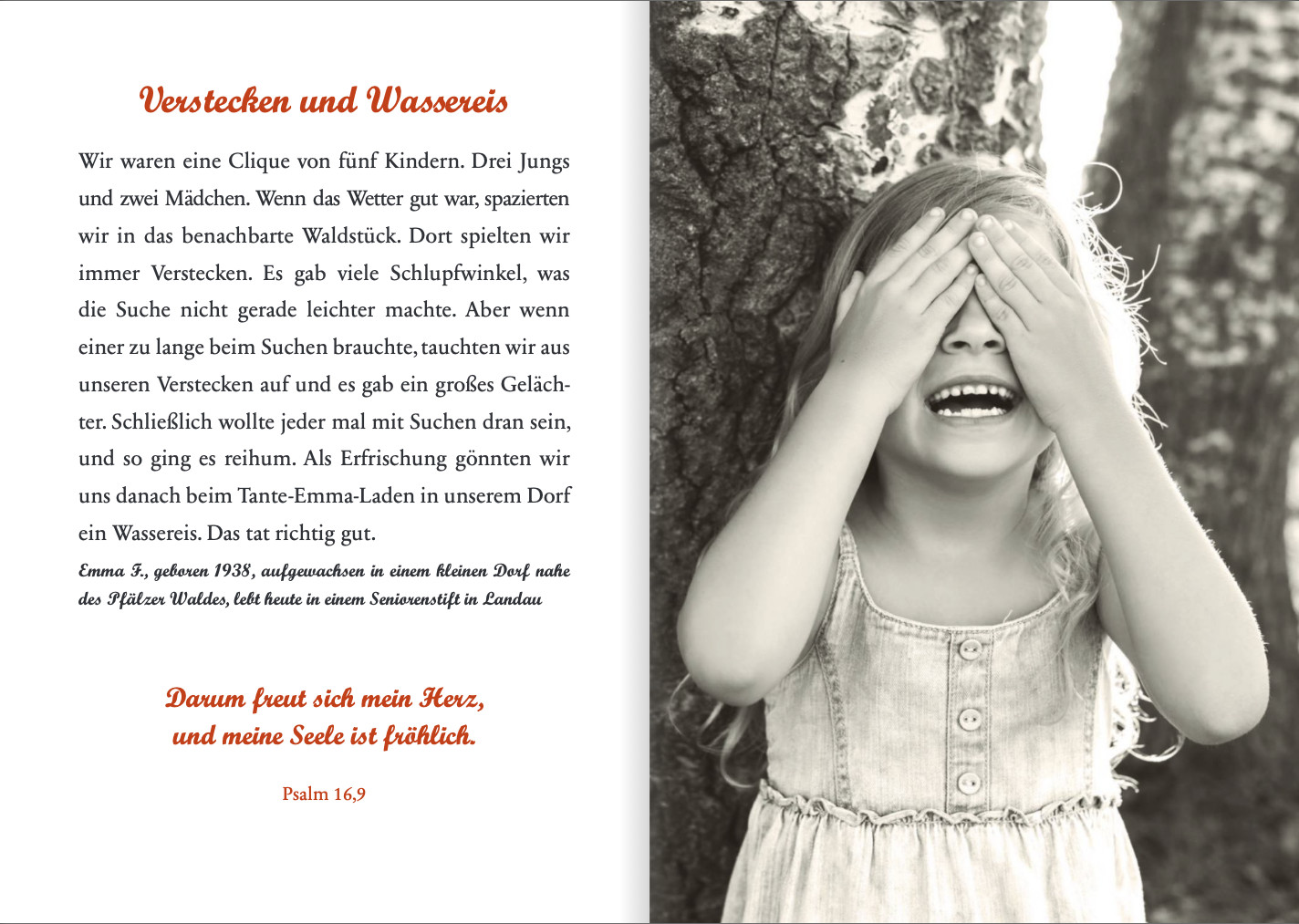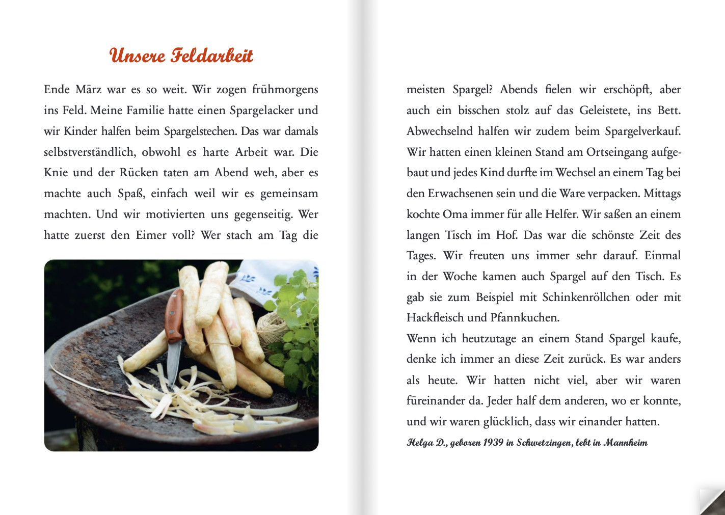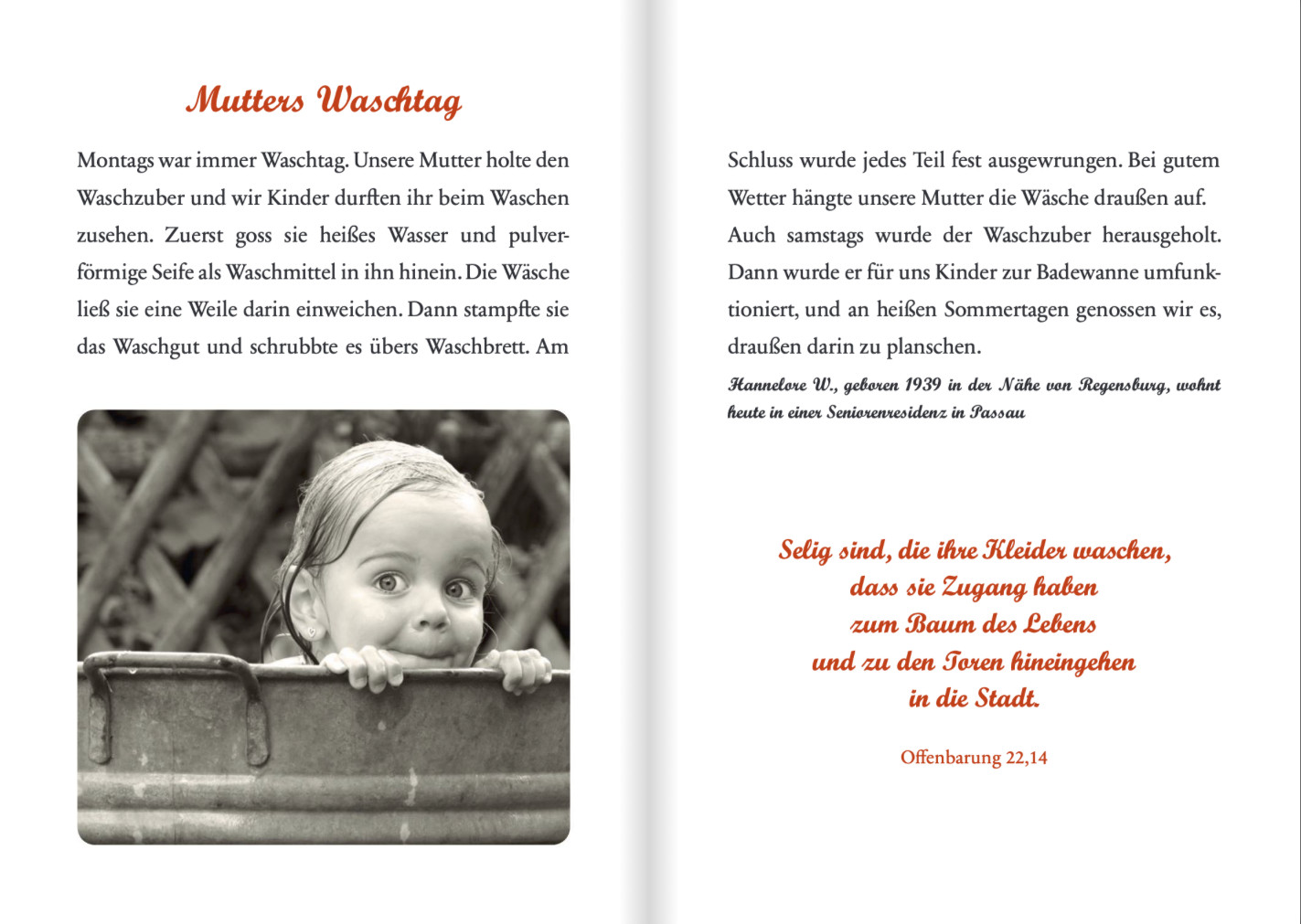 Die Geschichten greifen typische Erinnerungen älterer Generationen auf – Dorfleben ohne Telefon, gemeinsames Anpacken bei der Arbeit, das Spiel im Freien und das wöchentliche Bad im Waschzuber. So entstehen vertraute Bilder, die Lächeln hervorrufen und Türen zu persönlichen Lebensgeschichten öffnen.