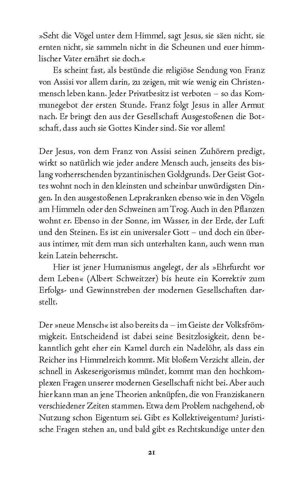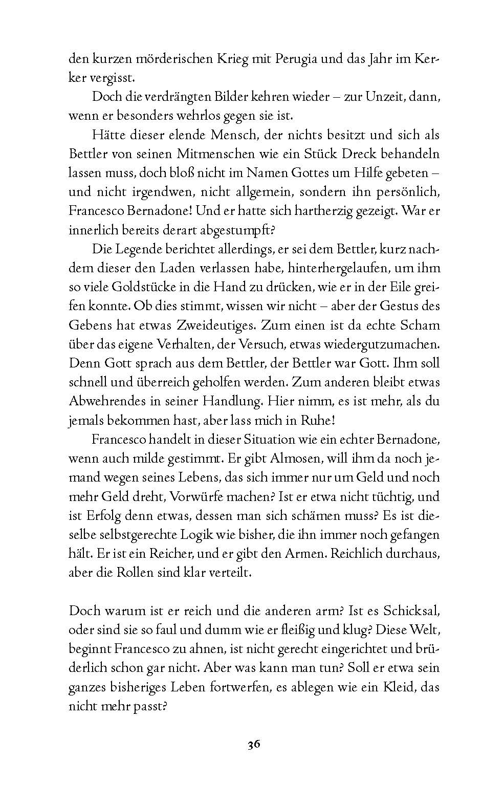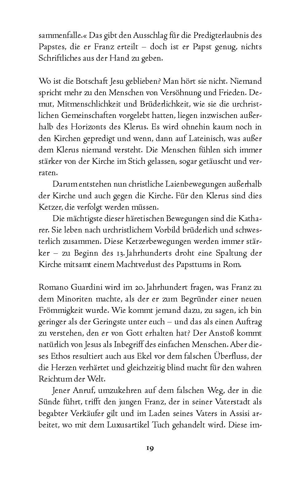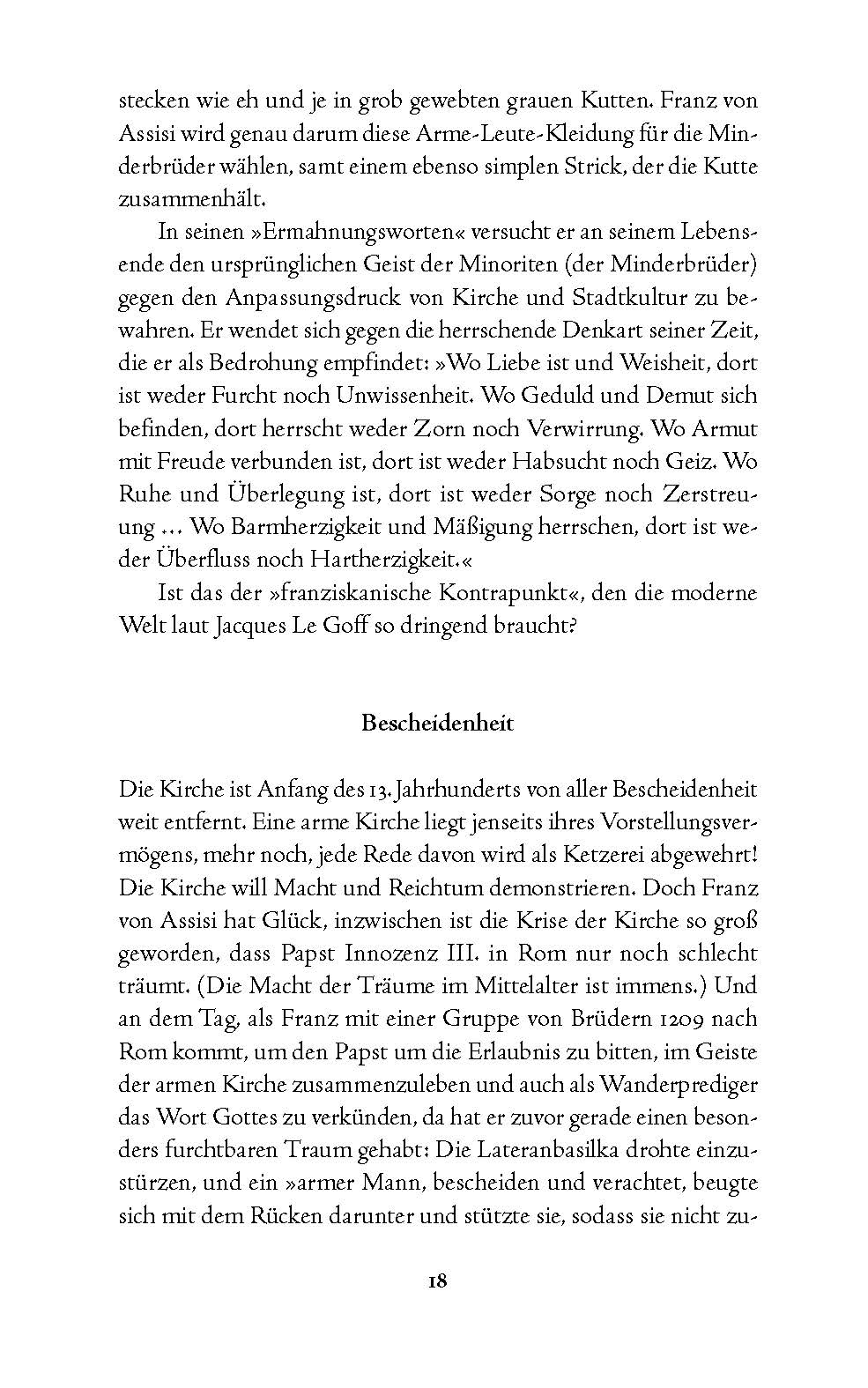 Mit Franz von Assisi steht ein erstaunlich moderner Mensch vor uns. Er verkörpert einen neuen Geist, der auf Wandlung und Bescheidenheit setzt. Anfangs wird seine Bewegung, die eine Bruderschaft und kein Orden sein will, von einer Handvoll „minderer Brüder“ getragen. Sie fordern mehr Demut des Menschen vor der Schöpfung. Auch der neue Reichtum der Städte (sein Vater ist ein erfolgreicher Tuchhändler in Assisi) stößt ihn ab. Franz von Assisi will, dass seine Brüder arbeiten, aber nicht für Geld, sondern für Essen und ein Dach über dem Kopf. Betteln sollen sie nur im Notfall.