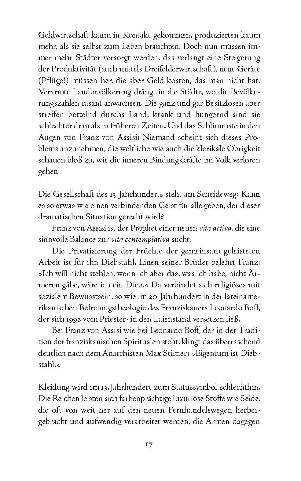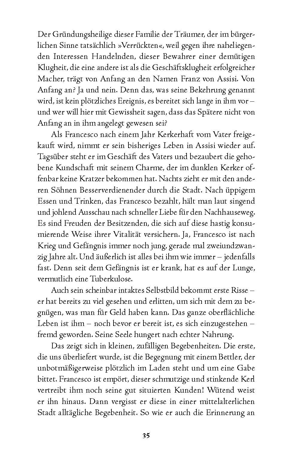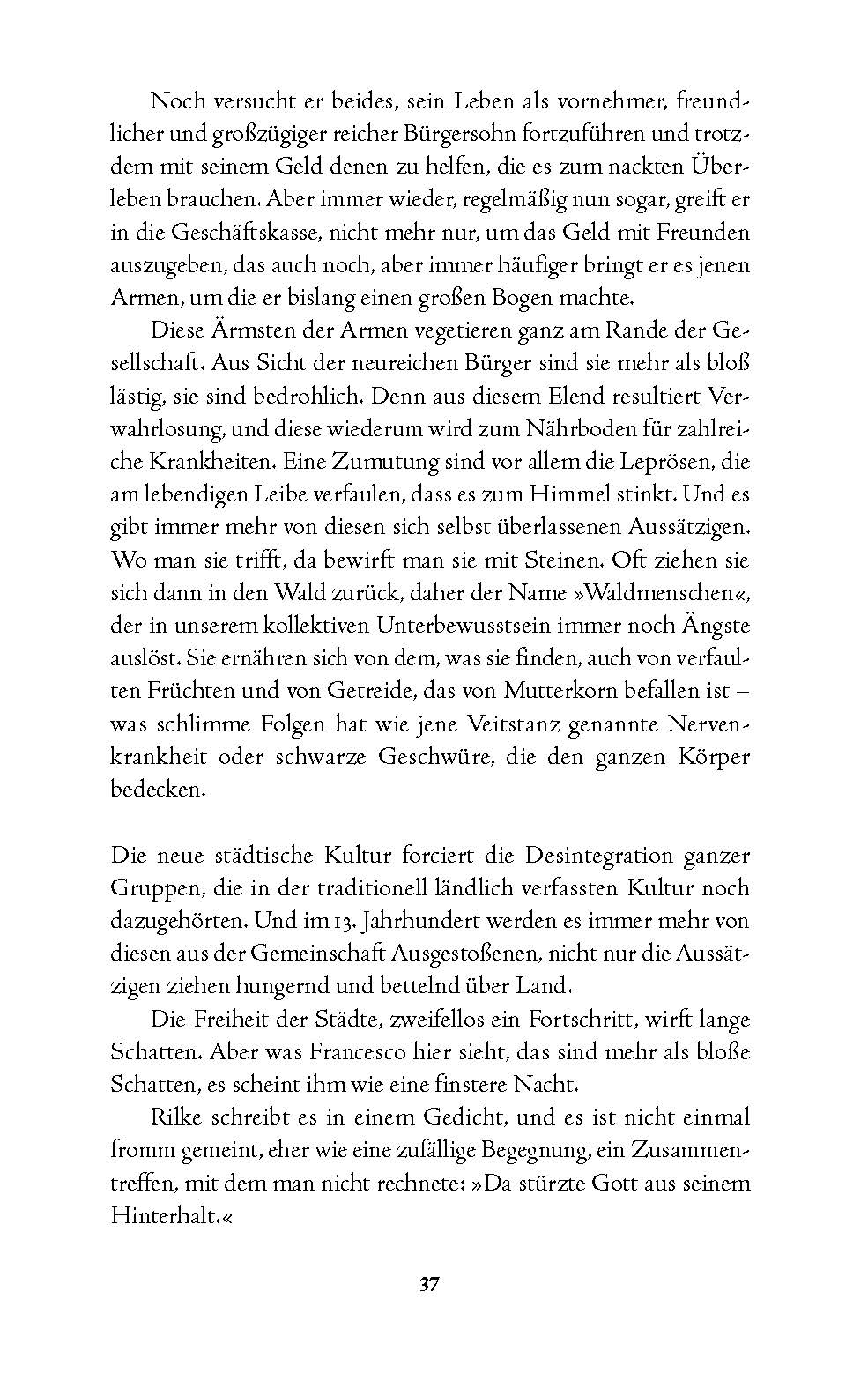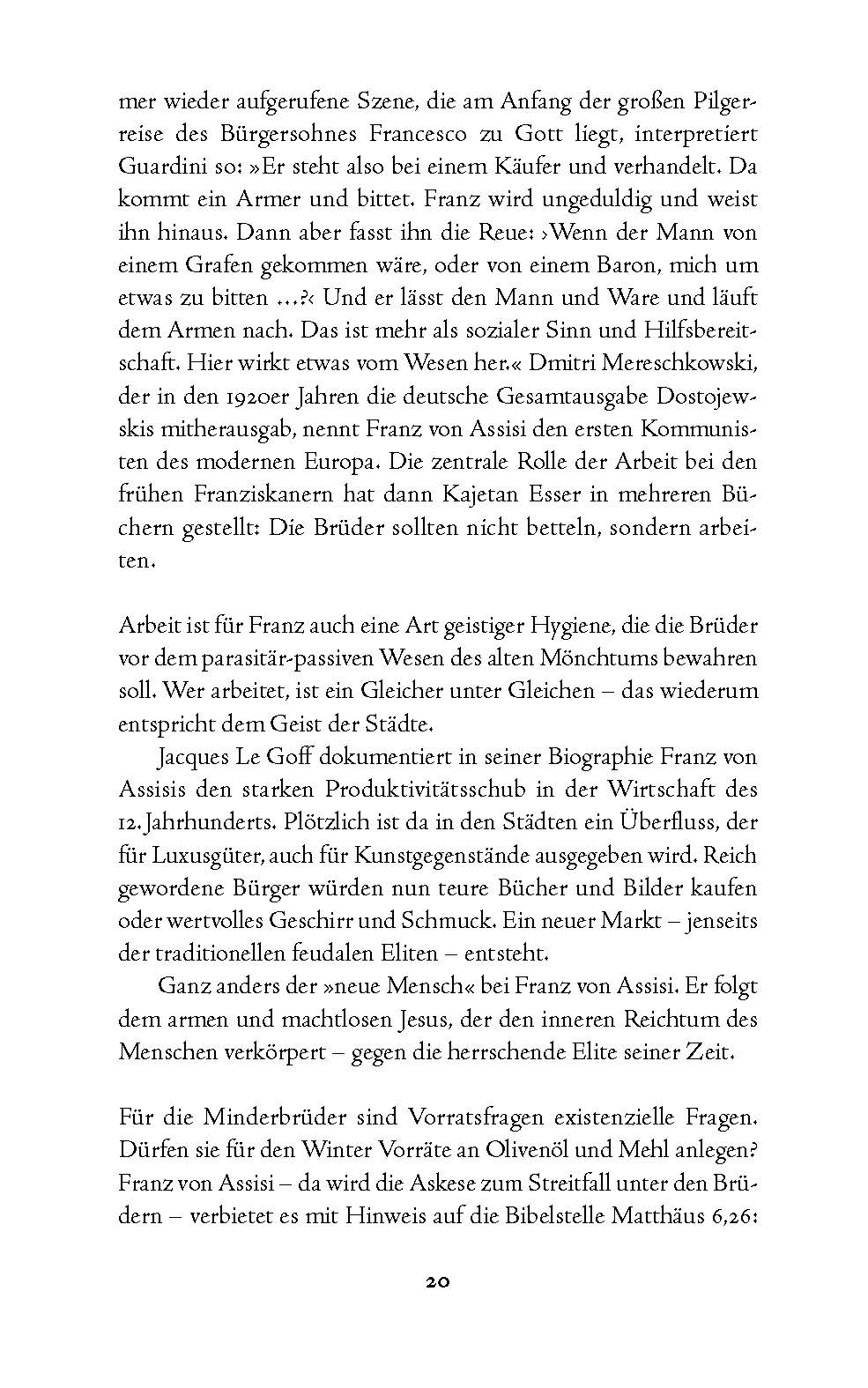 Mit Franz von Assisi steht ein erstaunlich moderner Mensch vor uns. Er verkörpert einen neuen Geist, der auf Wandlung und Bescheidenheit setzt. Anfangs wird seine Bewegung, die eine Bruderschaft und kein Orden sein will, von einer Handvoll „minderer Brüder“ getragen. Sie fordern mehr Demut des Menschen vor der Schöpfung. Auch der neue Reichtum der Städte (sein Vater ist ein erfolgreicher Tuchhändler in Assisi) stößt ihn ab. Franz von Assisi will, dass seine Brüder arbeiten, aber nicht für Geld, sondern für Essen und ein Dach über dem Kopf. Betteln sollen sie nur im Notfall.