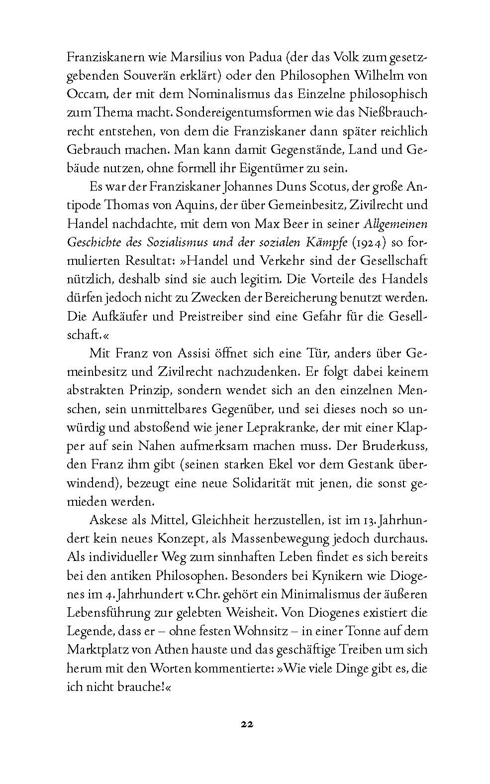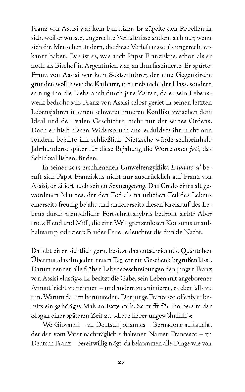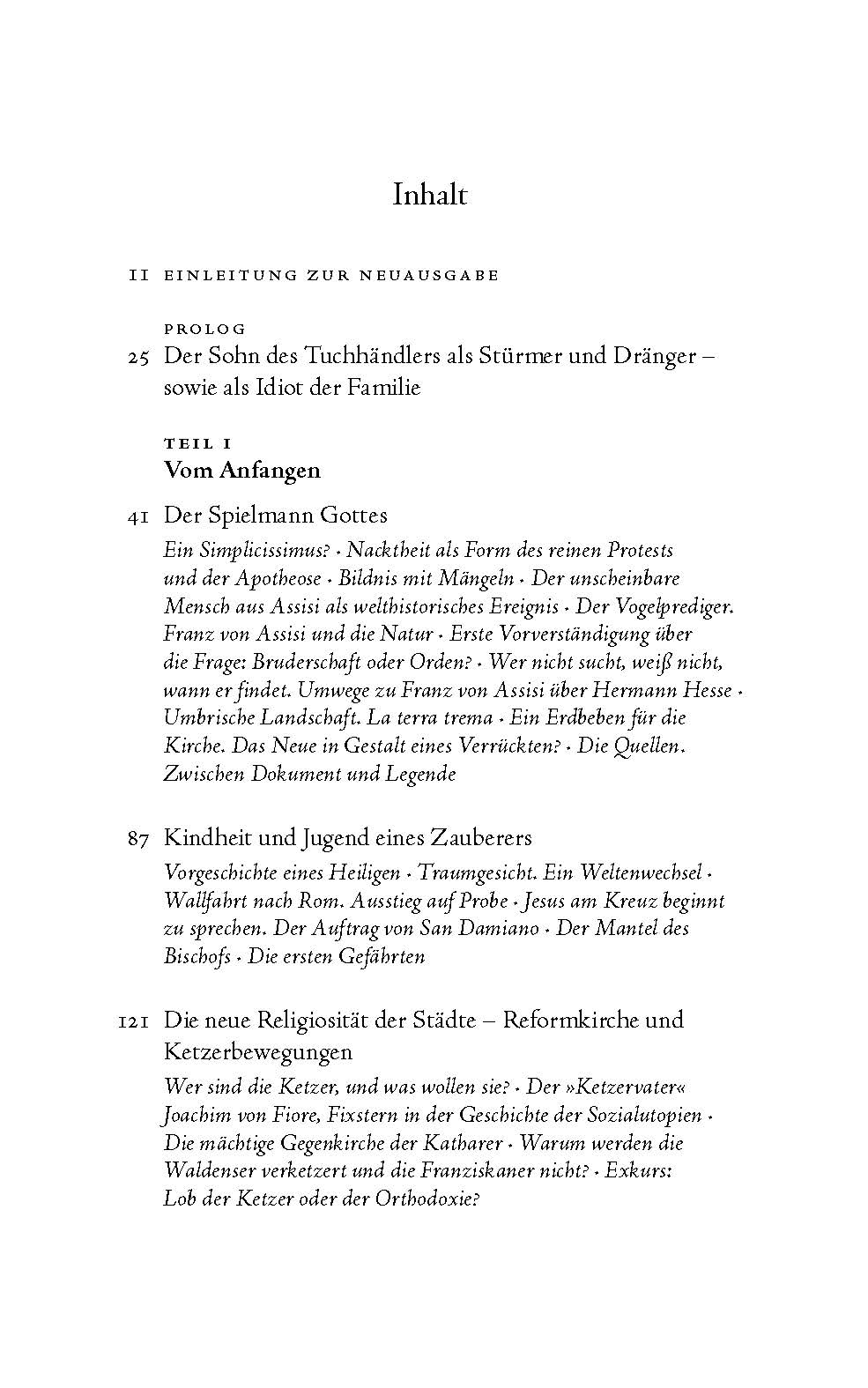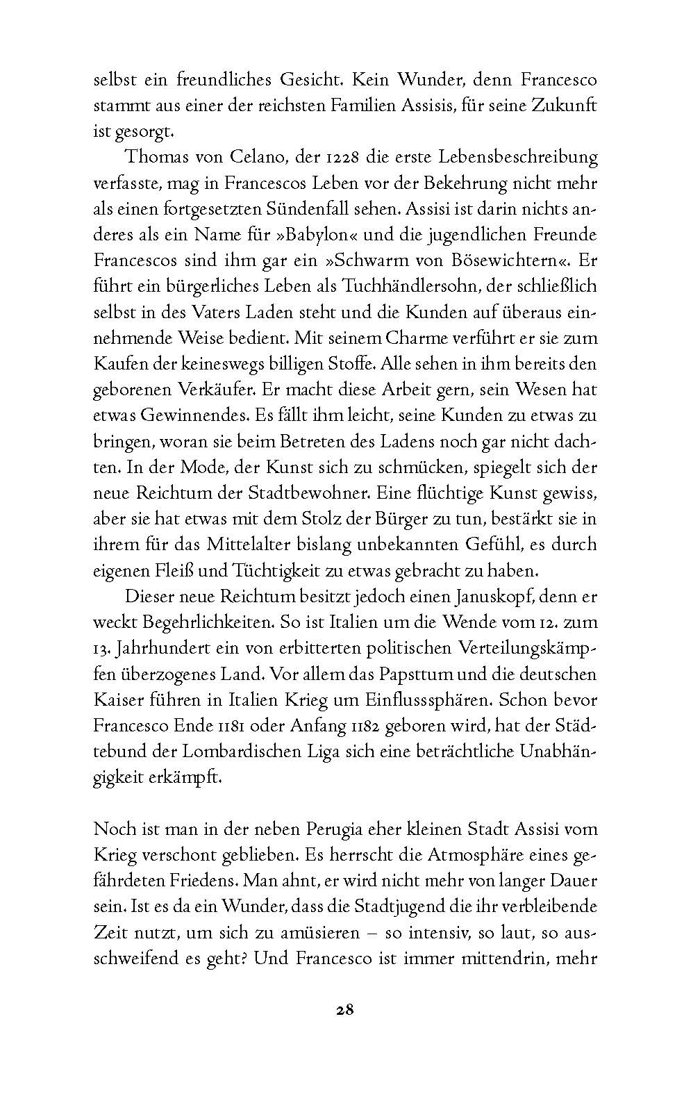 Mit Franz von Assisi steht ein erstaunlich moderner Mensch vor uns. Er verkörpert einen neuen Geist, der auf Wandlung und Bescheidenheit setzt. Anfangs wird seine Bewegung, die eine Bruderschaft und kein Orden sein will, von einer Handvoll „minderer Brüder“ getragen. Sie fordern mehr Demut des Menschen vor der Schöpfung. Auch der neue Reichtum der Städte (sein Vater ist ein erfolgreicher Tuchhändler in Assisi) stößt ihn ab. Franz von Assisi will, dass seine Brüder arbeiten, aber nicht für Geld, sondern für Essen und ein Dach über dem Kopf. Betteln sollen sie nur im Notfall.
