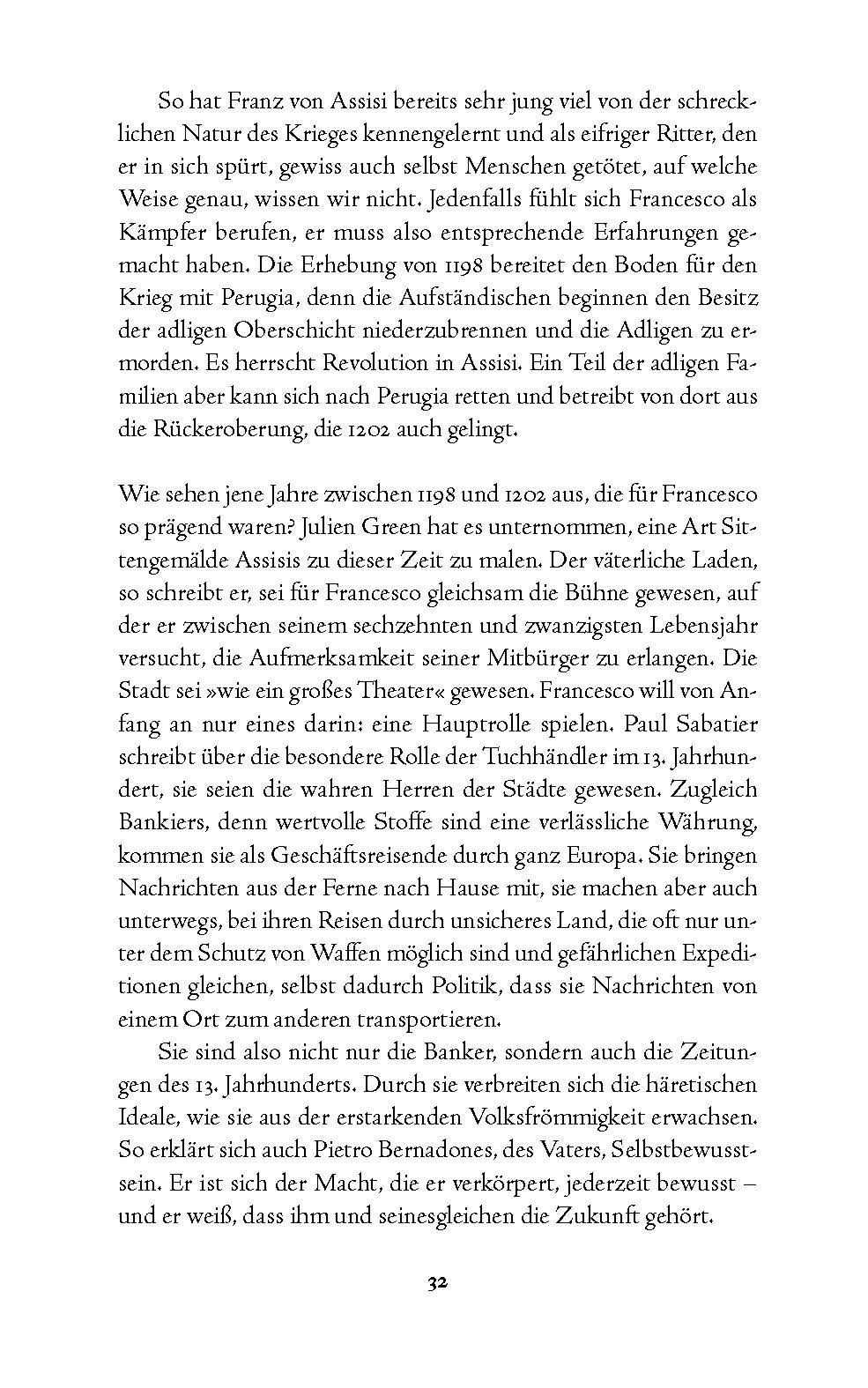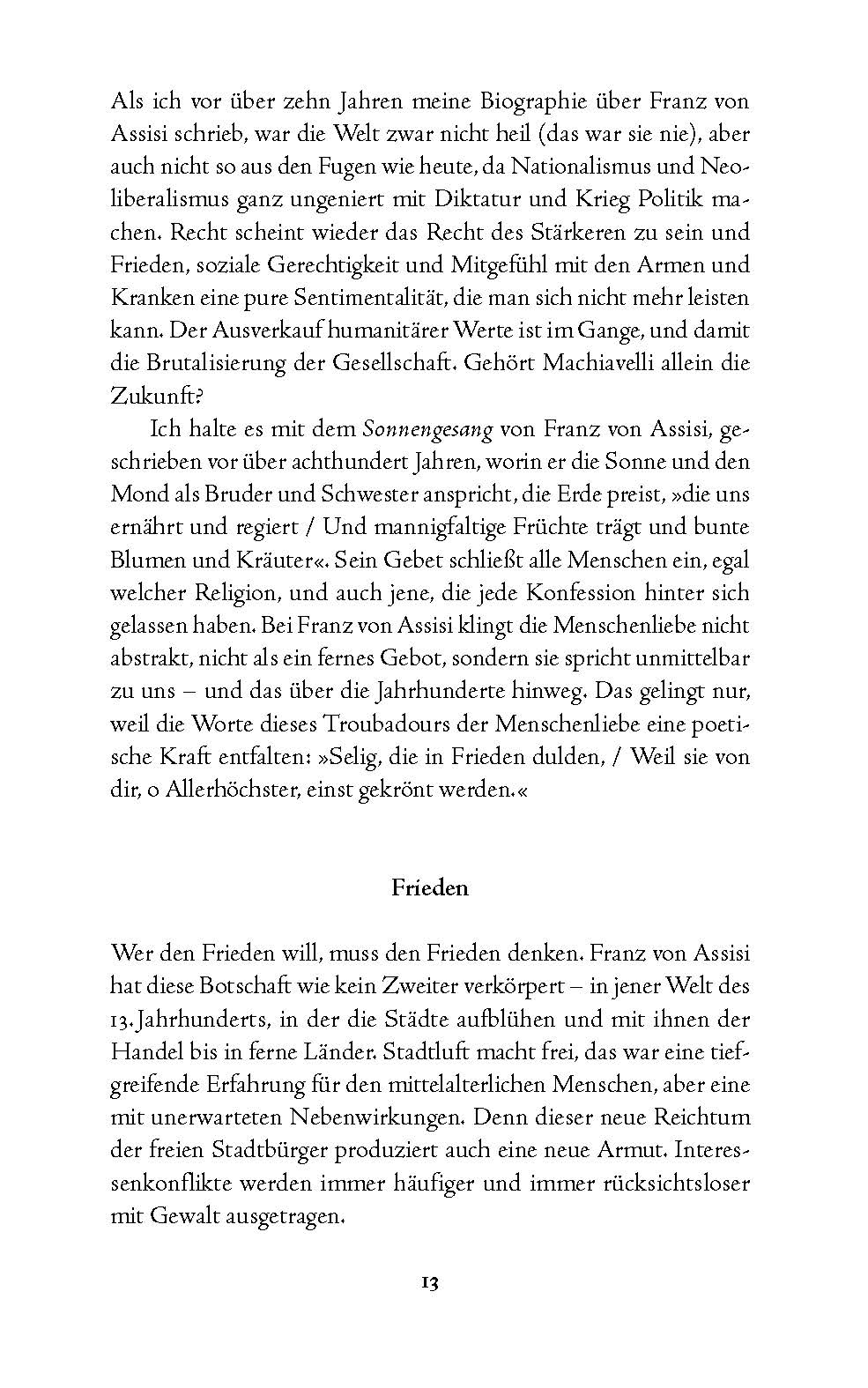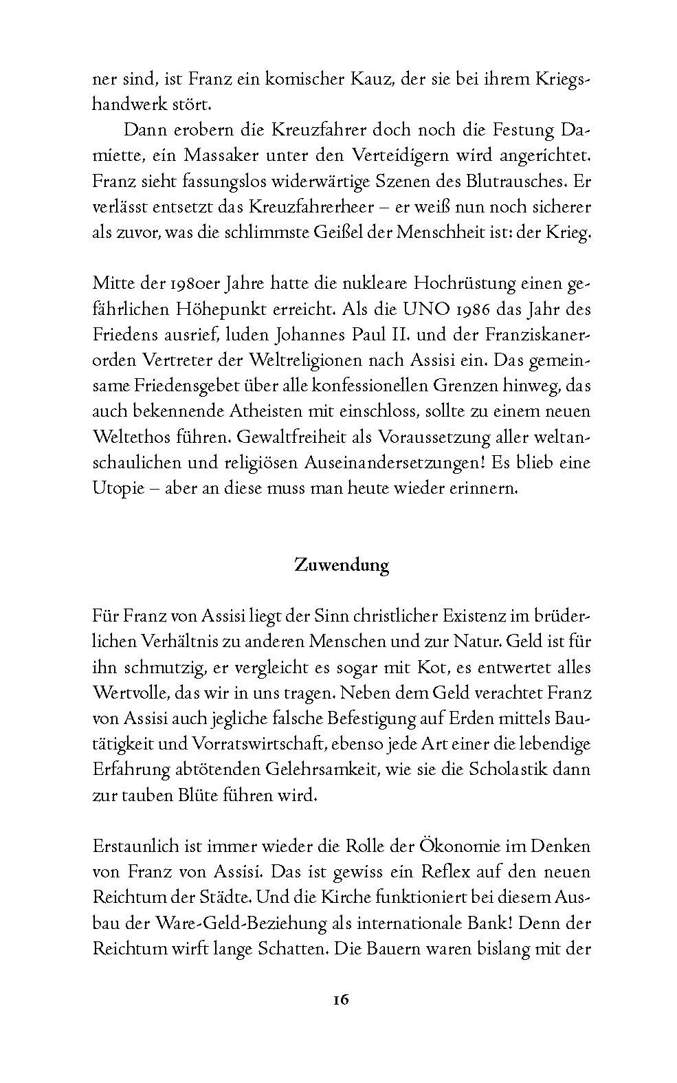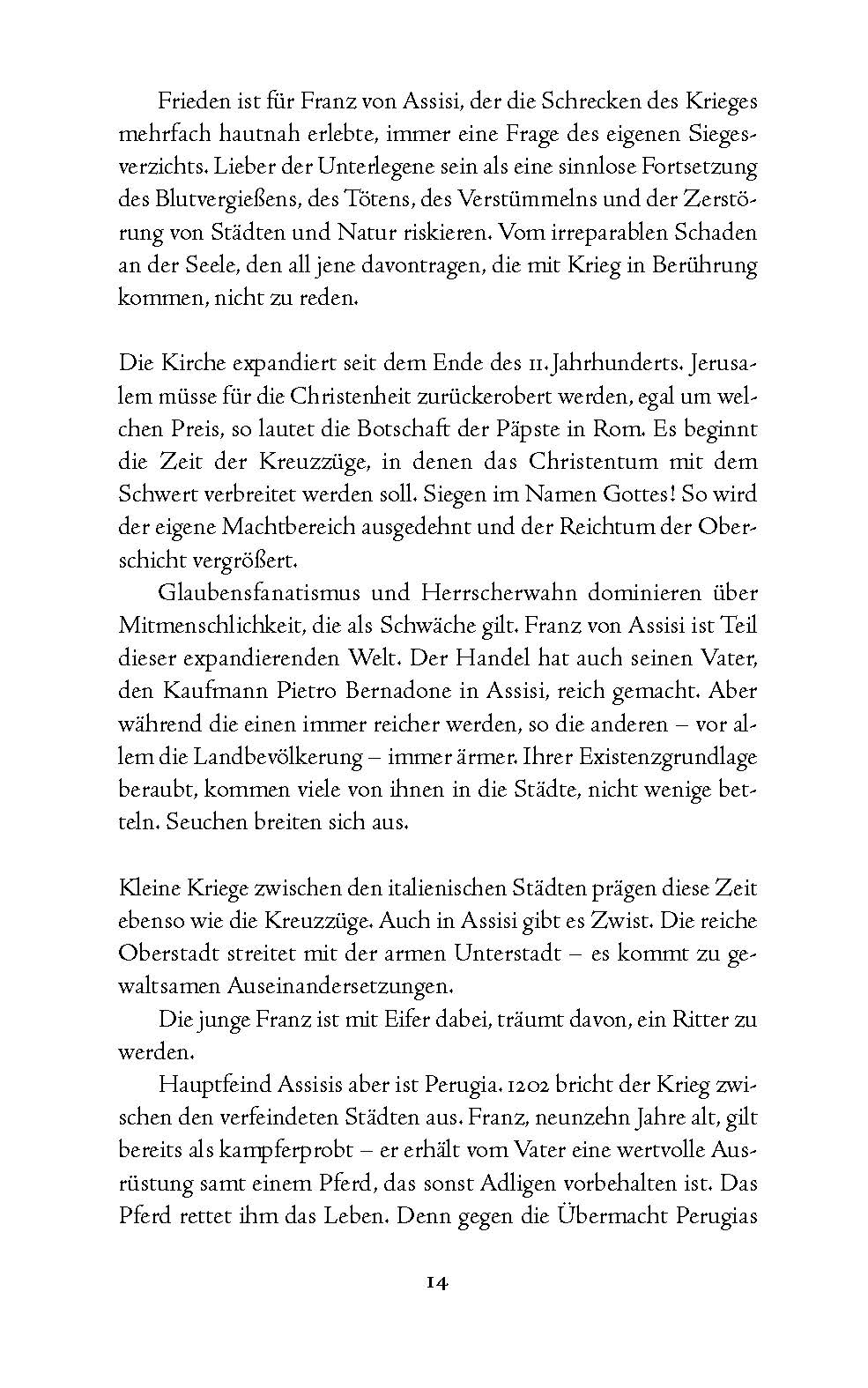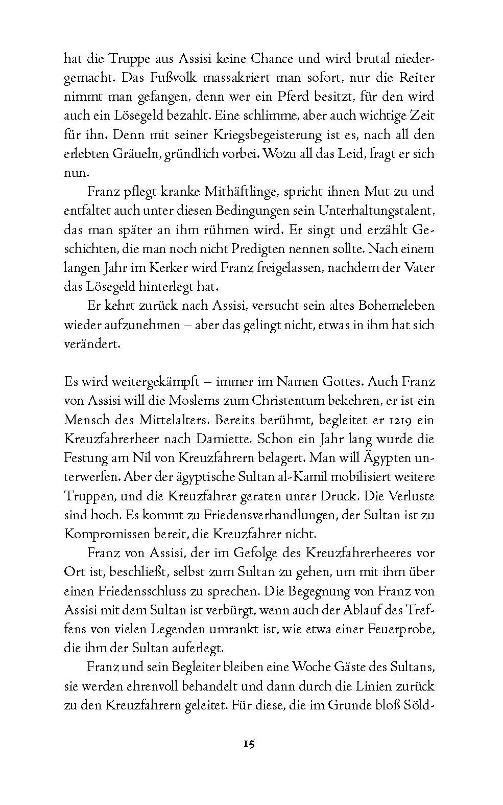 Und Franz von Assisi? Er trifft 1219 im ägyptischen Damiette den Anführer der feindlichen Moslems, Sultan Melek al-Kamil, einen klugen Herrscher wie aus Lessings Ringparabel, der ihn tief beeindruckt. Das Treffen ist verbürgt. Im Gespräch erkennen sie, dass der wahre Glaube vom Frieden nicht zu trennen ist. Nach dieser Begegnung mit dem Sultan bricht Franz von Assisi endgültig mit der Kreuzzugsideologie.