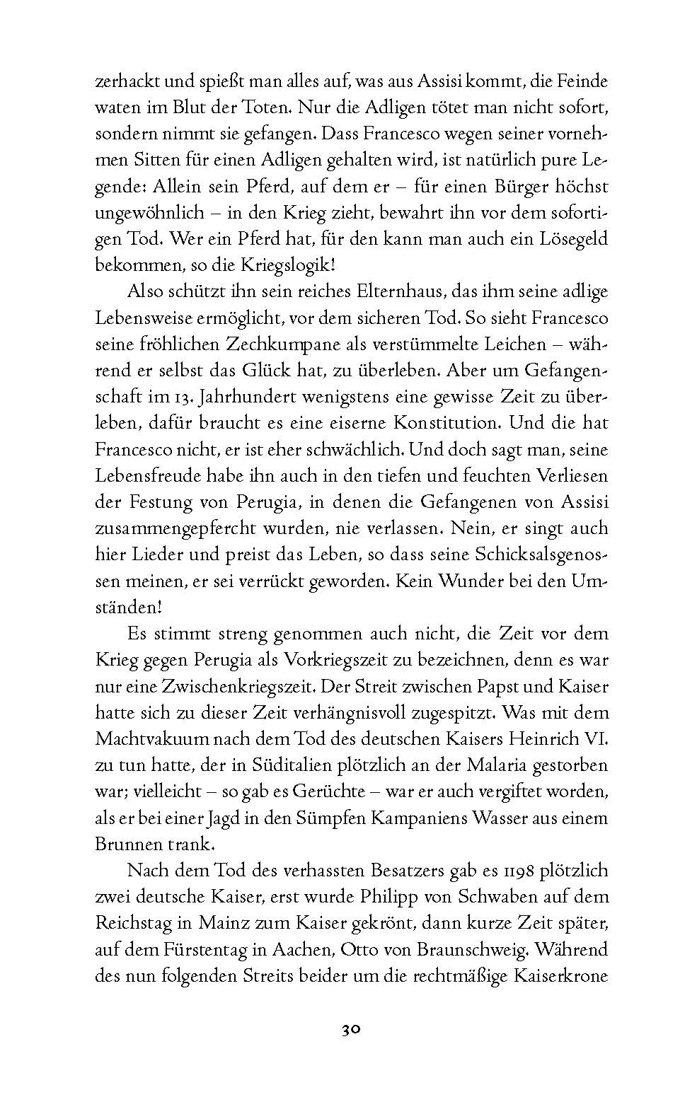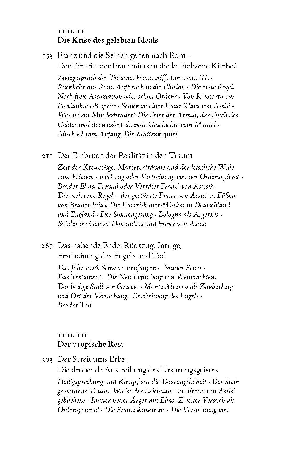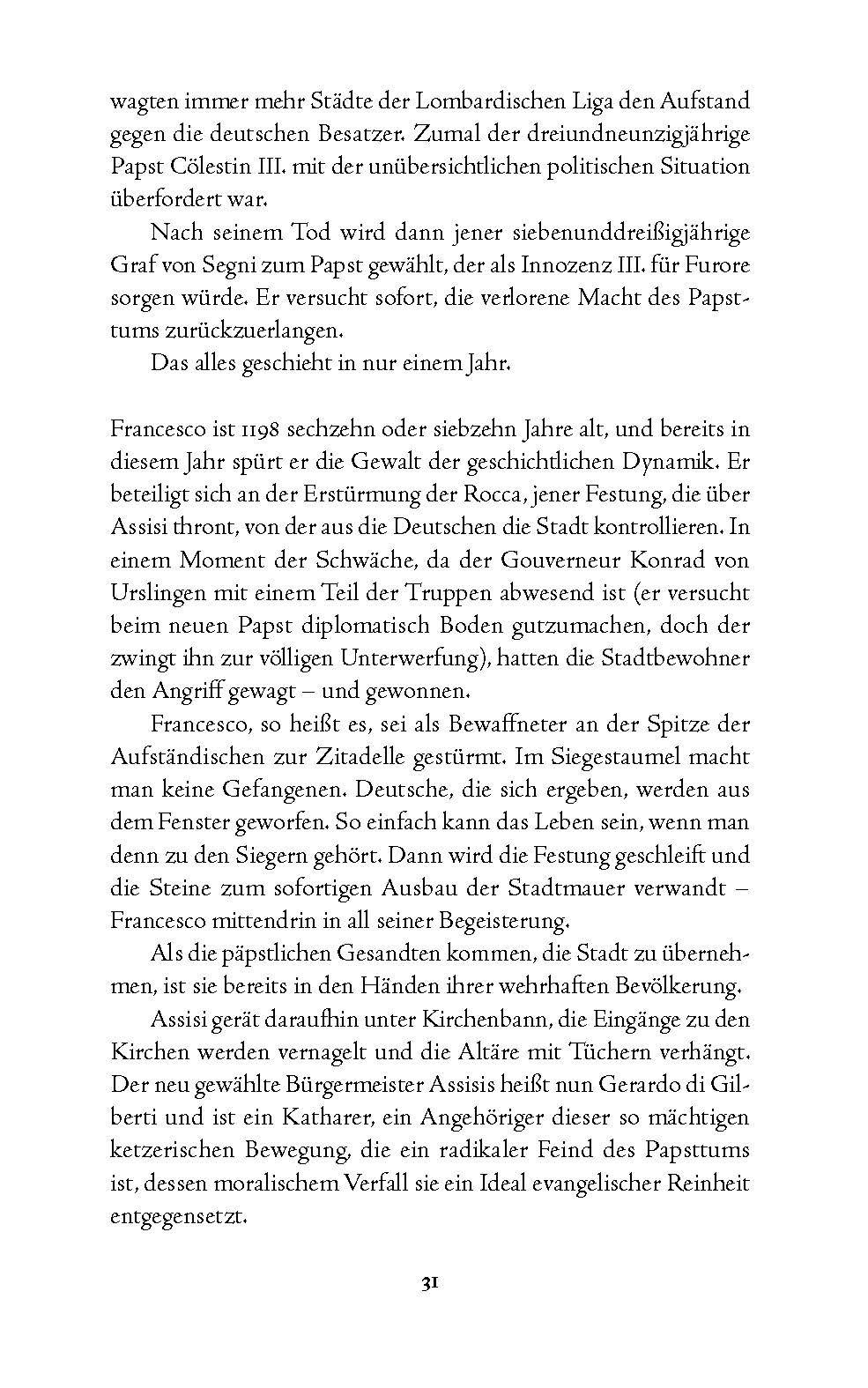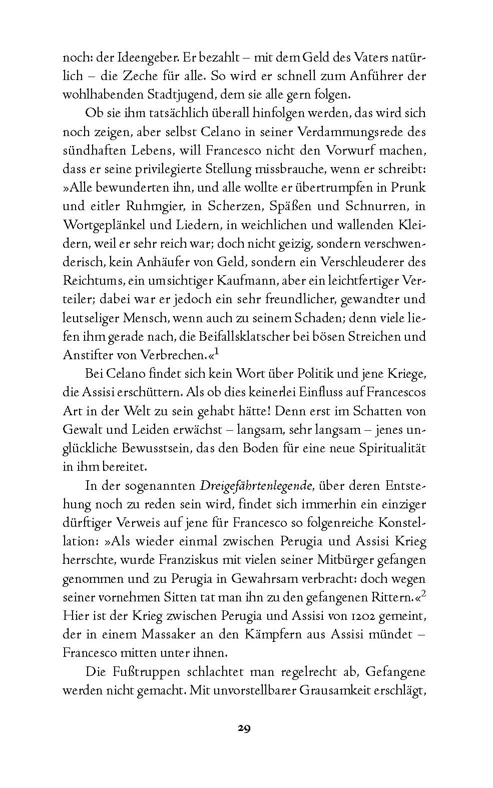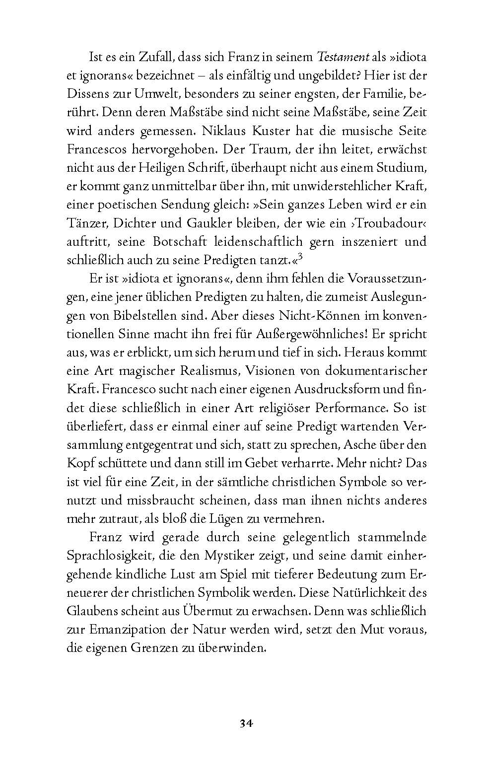 Und Franz von Assisi? Er trifft 1219 im ägyptischen Damiette den Anführer der feindlichen Moslems, Sultan Melek al-Kamil, einen klugen Herrscher wie aus Lessings Ringparabel, der ihn tief beeindruckt. Das Treffen ist verbürgt. Im Gespräch erkennen sie, dass der wahre Glaube vom Frieden nicht zu trennen ist. Nach dieser Begegnung mit dem Sultan bricht Franz von Assisi endgültig mit der Kreuzzugsideologie.