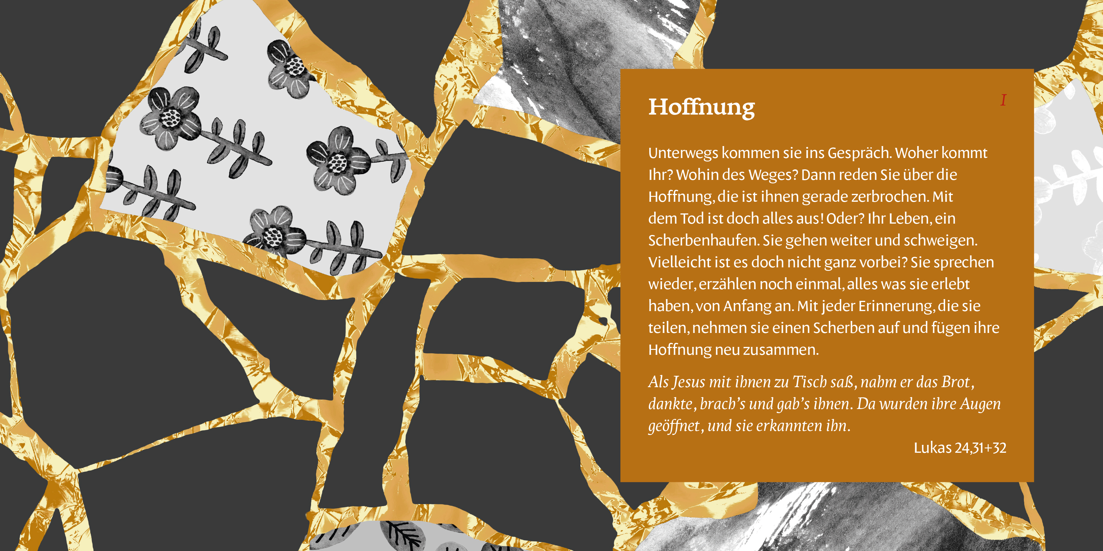 Das Motiv von Stefanie Bahlinger spürt dem Hoffnungsthema der Jahreslosung nach: Licht, Farbe und eine reduzierte Bildsprache öffnen Raum für persönliche Deutungen. Bahlingers Arbeiten zeichnen sich durch eine ruhige, kontemplative Ästhetik aus, die gut in Gottesdienste, Segensaktionen und Gemeindearbeit passt.
