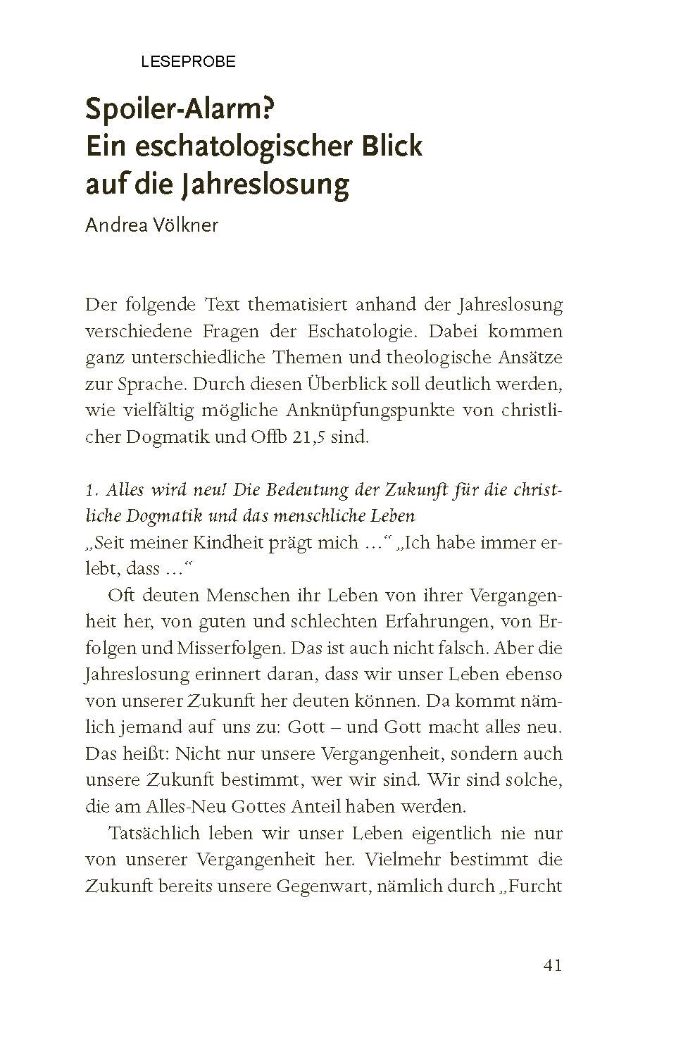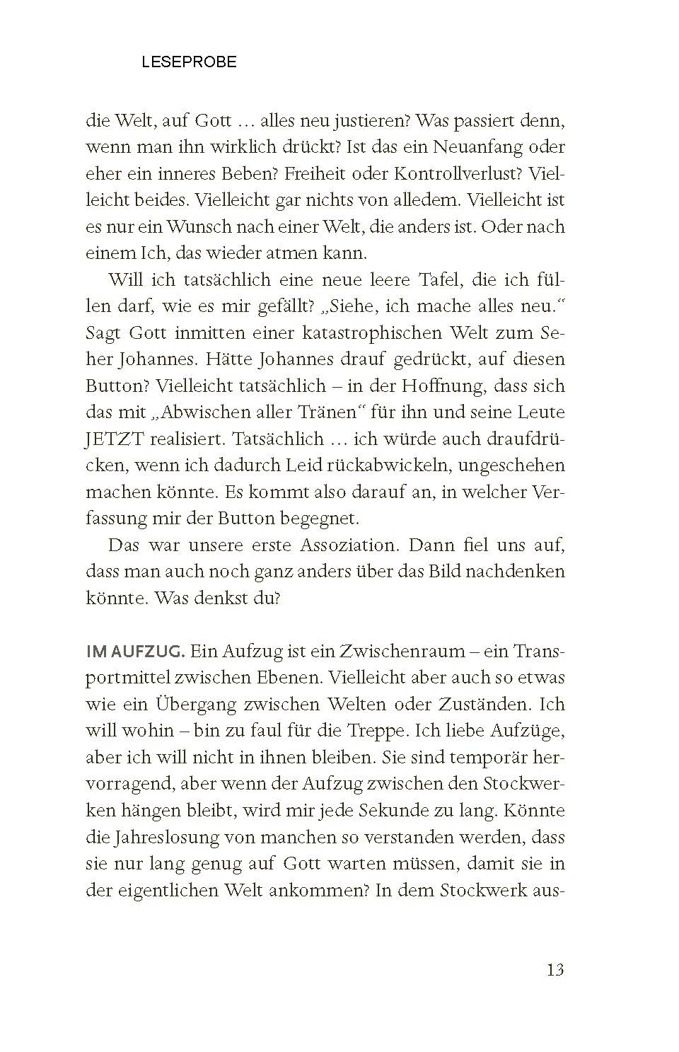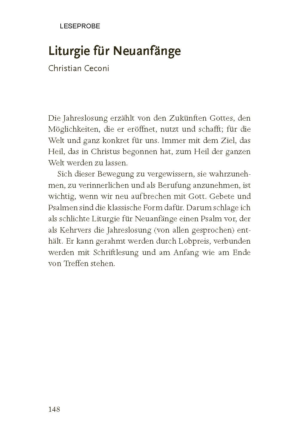 Enthalten sind: eine gute verständliche Auslegung zielgruppengerechte Entwürfe und flexible Bausteine Andachten, Meditationen, Impulse und Gebete kreative und interaktive Formate Highlight: Gesprächsimpulse zum Jahreslosungsbild der beiliegenden Postkarte Weitere Beiträge von: - Felix Eiffler (Universität Halle) - Andrea Völkner (Berliner Stadtmission) - Heinzpeter Hempelmann (Philosoph und Theologe) - Andreas Rauhut (TSB) - Carolin Reifenberg (TSB) - Clara Wirth (TSB) - Henriette Oster (Religionslehrerin) - Johannina Wenk (Gemeindepädagogin) - Gerold Vorländer (Berliner Stadtmission) - Nathanael Bader (TSB) - Hannes Wolf (Berliner Stadtmission) - Dariia Zemlianova (TSB) - Christian Ceconi (Berliner Stadtmission) - Paula Otterbach (Junge Kirche Berlin) - Anna Behnke (Berliner Stadtmission) - Richard Schwope (TSB) - Nicolas & Eva Viziotis (Berliner Stadtmission)
