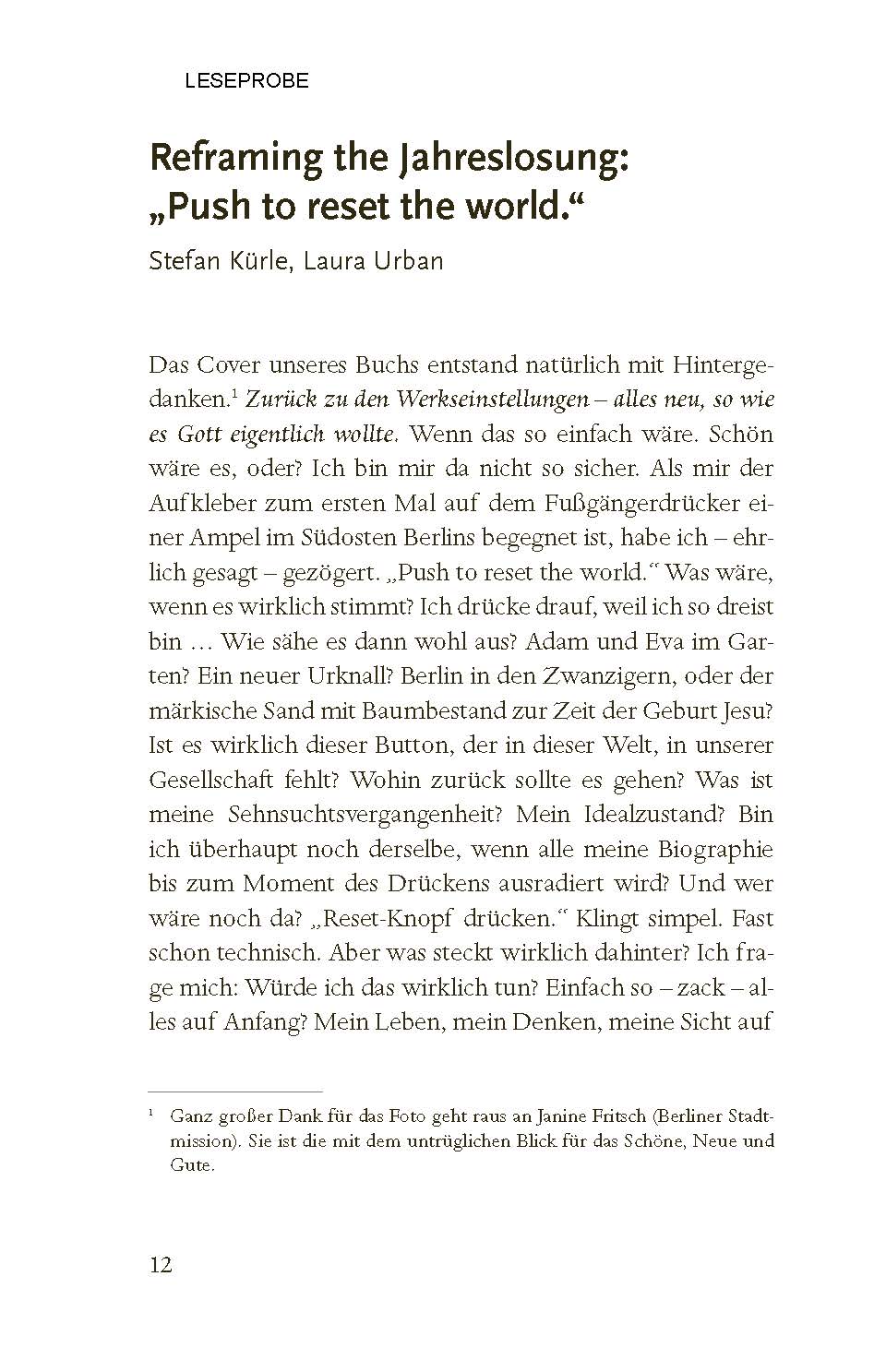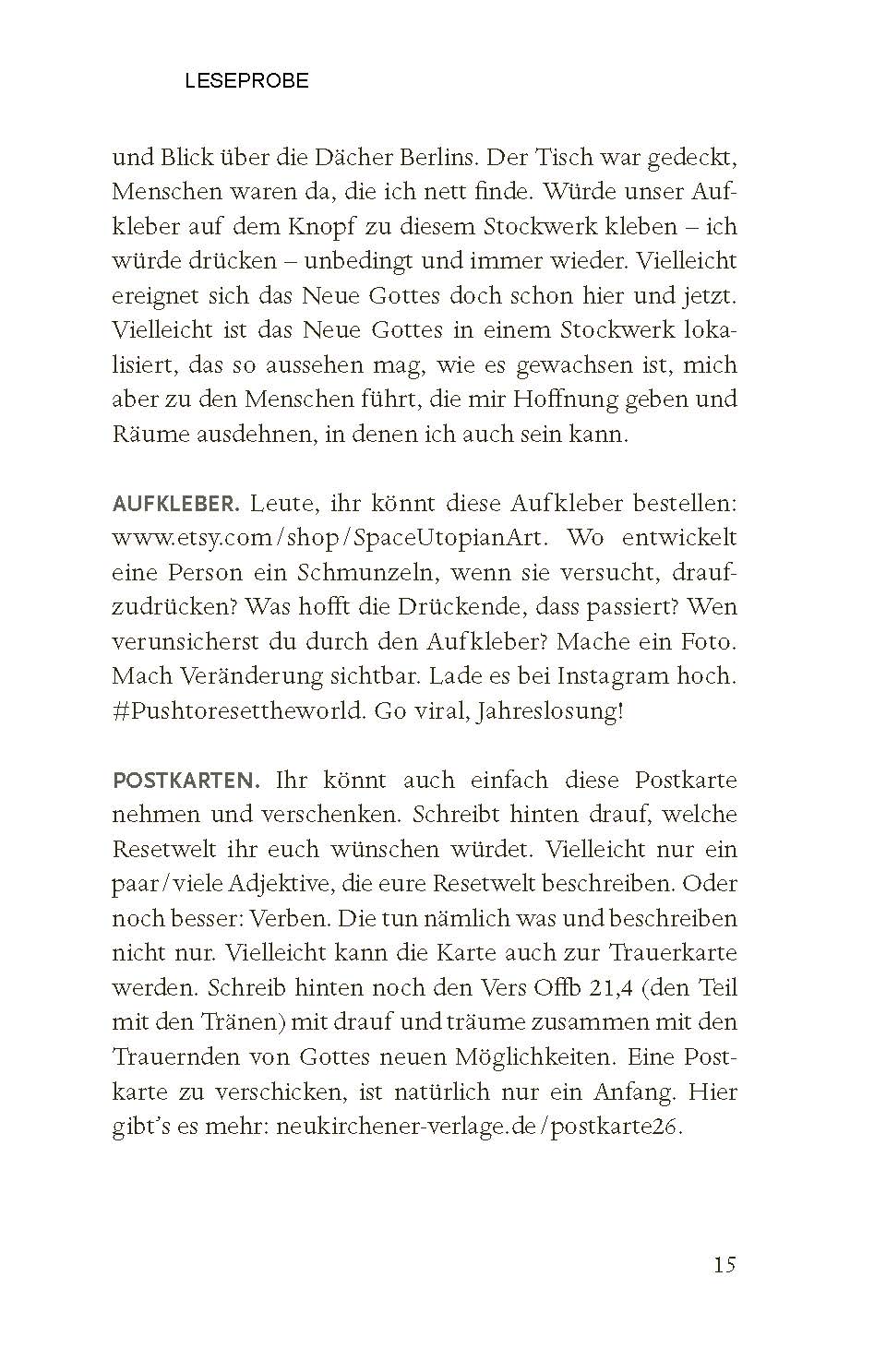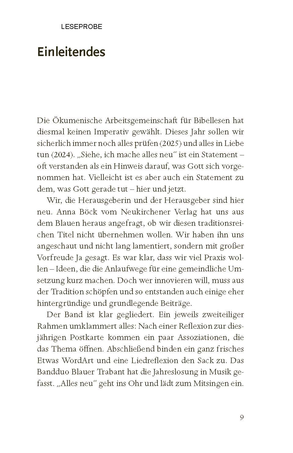 Enthalten sind: eine gute verständliche Auslegung zielgruppengerechte Entwürfe und flexible Bausteine Andachten, Meditationen, Impulse und Gebete kreative und interaktive Formate Highlight: Gesprächsimpulse zum Jahreslosungsbild der beiliegenden Postkarte Weitere Beiträge von: - Felix Eiffler (Universität Halle) - Andrea Völkner (Berliner Stadtmission) - Heinzpeter Hempelmann (Philosoph und Theologe) - Andreas Rauhut (TSB) - Carolin Reifenberg (TSB) - Clara Wirth (TSB) - Henriette Oster (Religionslehrerin) - Johannina Wenk (Gemeindepädagogin) - Gerold Vorländer (Berliner Stadtmission) - Nathanael Bader (TSB) - Hannes Wolf (Berliner Stadtmission) - Dariia Zemlianova (TSB) - Christian Ceconi (Berliner Stadtmission) - Paula Otterbach (Junge Kirche Berlin) - Anna Behnke (Berliner Stadtmission) - Richard Schwope (TSB) - Nicolas & Eva Viziotis (Berliner Stadtmission)