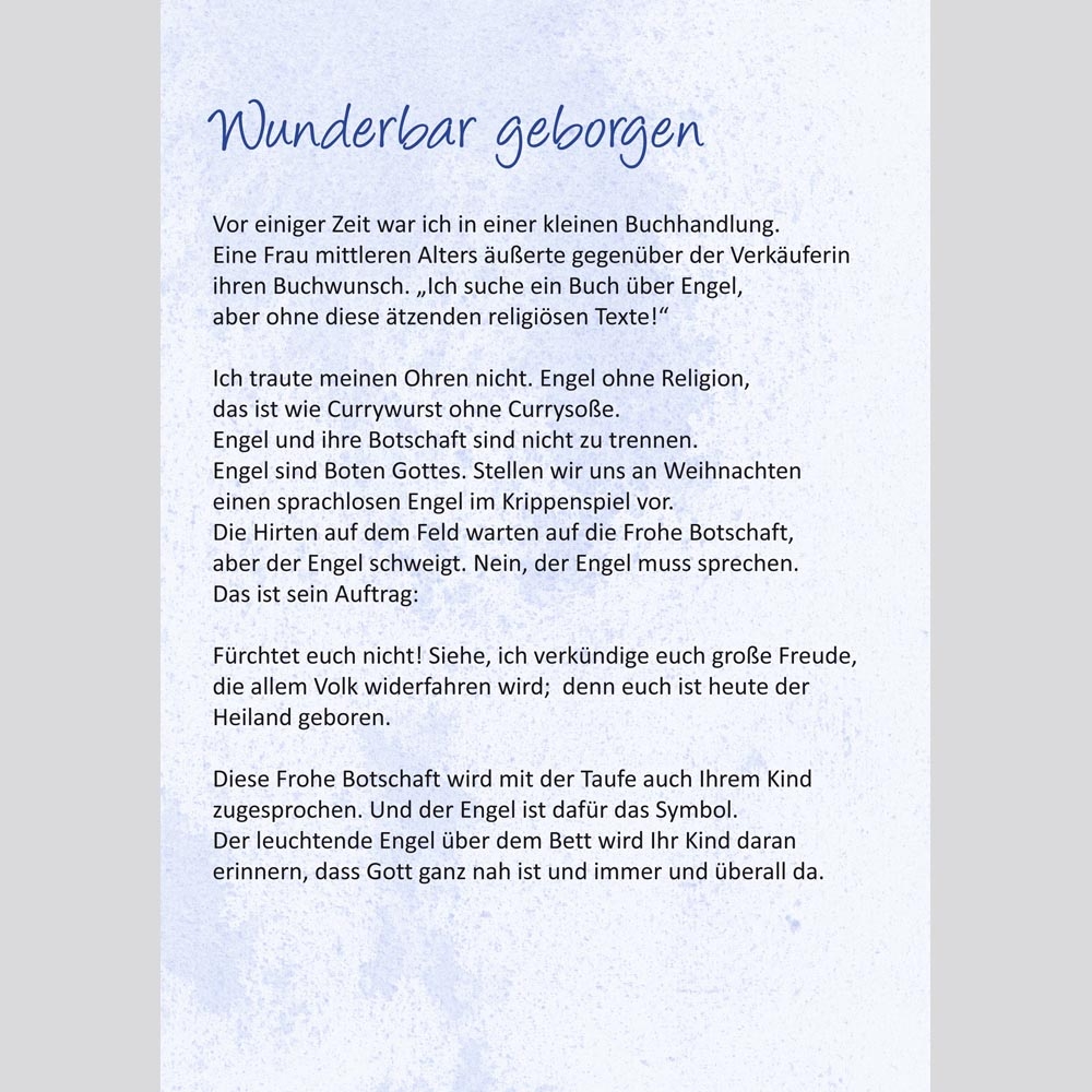 Der Engel steht für Gottes Nähe und Fürsorge. Kurze Texte vermitteln, dass niemand allein ist und wie Engel als Bild für Begleitung und Geborgenheit verstanden werden können.