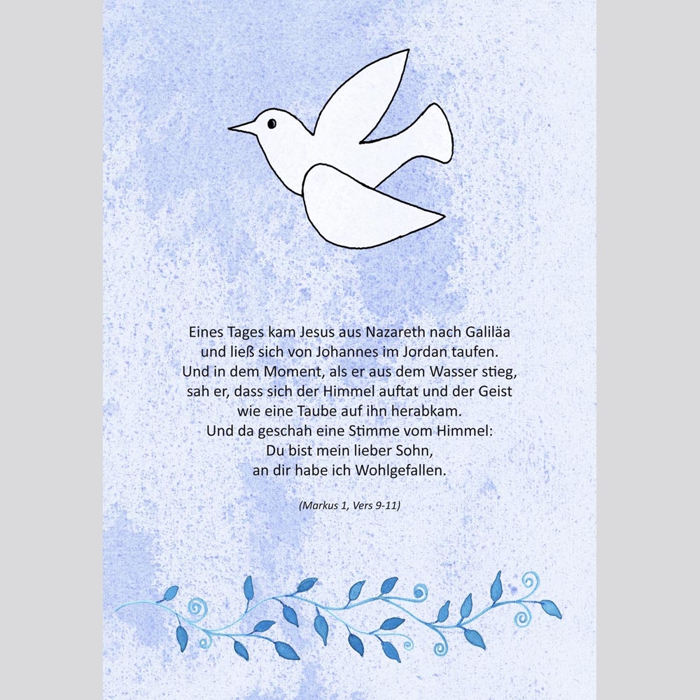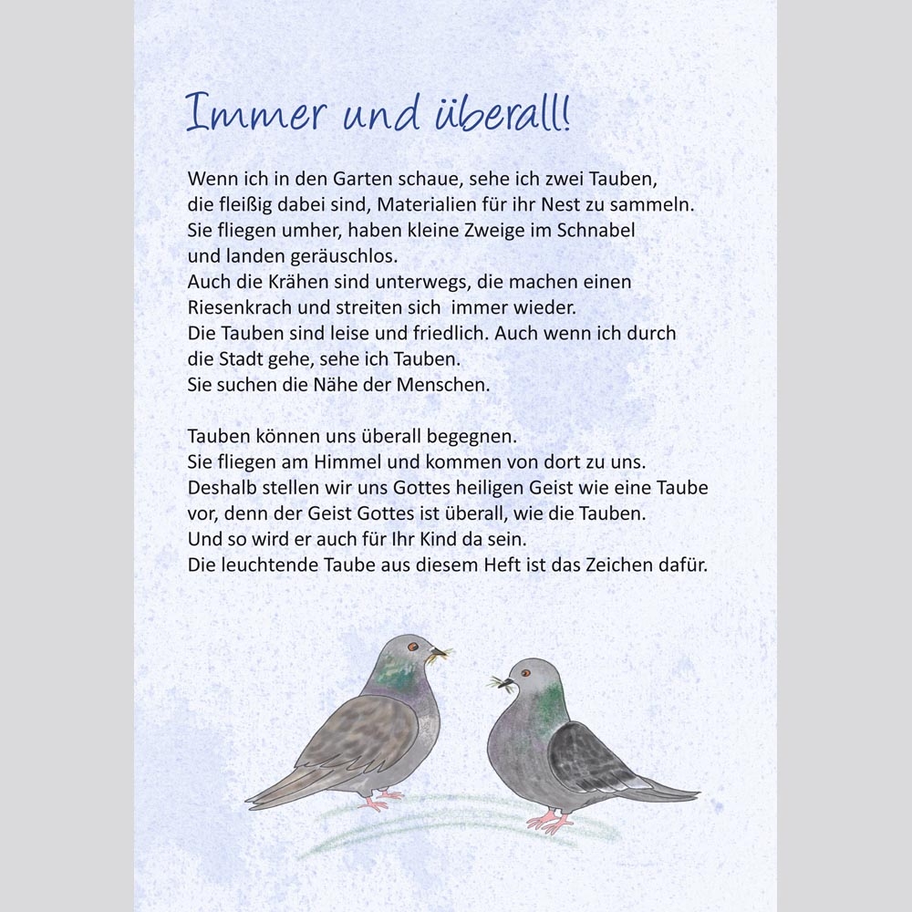 Die Taube symbolisiert den Heiligen Geist und die Zusage des Friedens. Bildimpulse und einfache Fragen regen dazu an, gemeinsam über Hoffnung, Vertrauen und Segen zu sprechen.