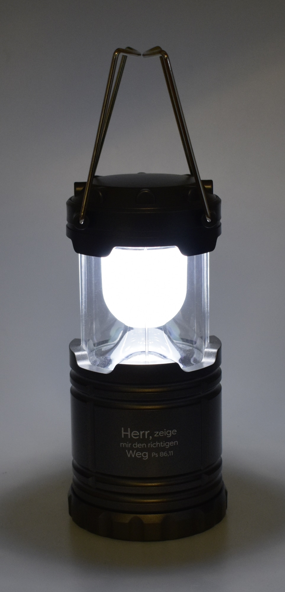 Die LED‑Laterne Simson ist eine handliche, robuste Campinglaterne mit sechs hellen LEDs und formschönem Kunststoffgehäuse in Anthrazit. Dank der zwei Metall‑Tragegriffe lässt sie sich sicher transportieren oder aufhängen; eingeschaltet wird die Laterne ganz einfach durch Auseinanderziehen des oberen Teils. Die klare Fensterabdeckung sorgt für gleichmäßiges, blendfreies Licht – ideal für Zeltlager, Gruppenstunden, Gartenabende oder als liebevolles Geschenk aus Ihrer Gemeinde. Batterien sind inklusive.