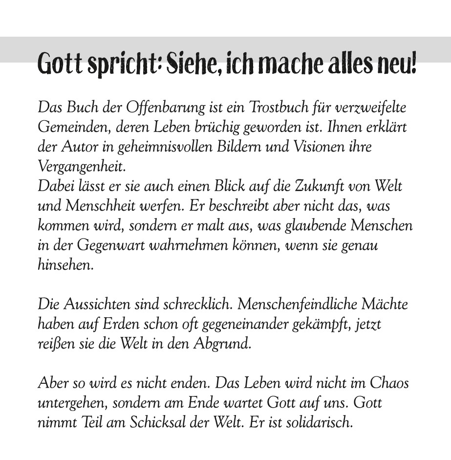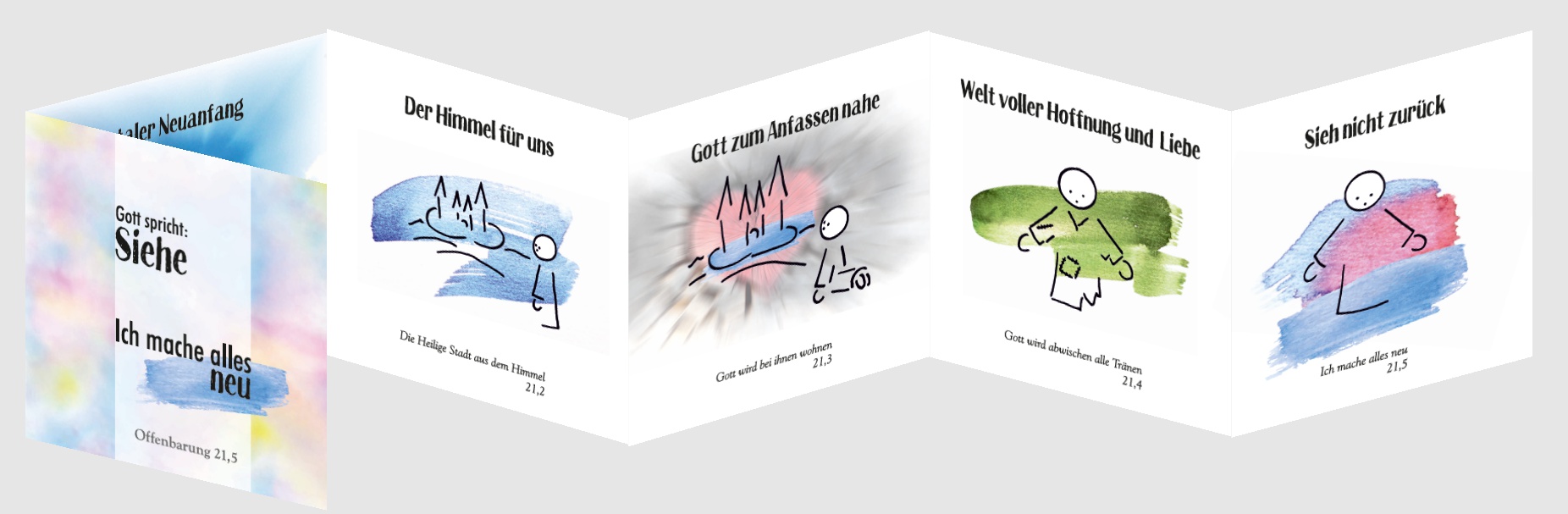 Das Bild zur Jahreslosung stammt von Stefanie Bahlinger. Ihre Gestaltung interpretiert den Hoffnungssatz „Siehe, ich mache alles neu!“ als einladendes, tröstliches Bild – geeignet, um Gespräche zu eröffnen und die Jahreslosung sichtbar in Gemeinde und Alltag zu tragen. Motiv- und Urheberangabe: Stefanie Bahlinger / Verlag am Birnbach.