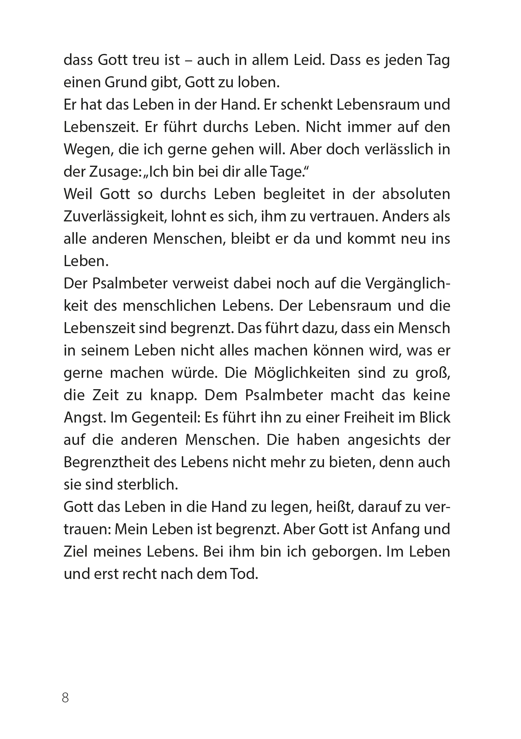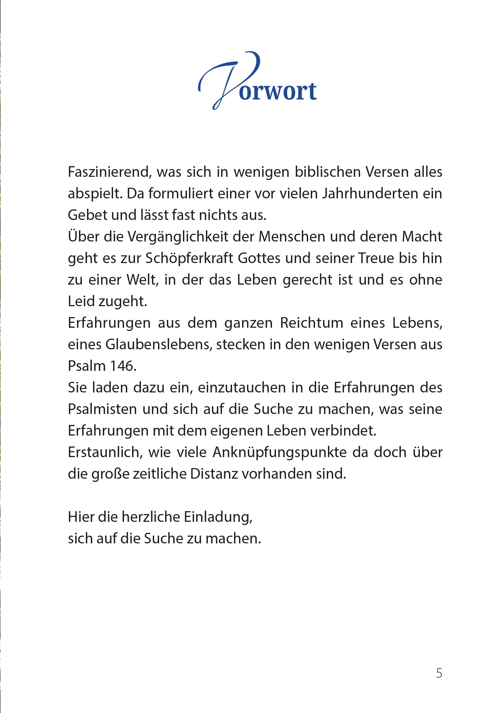 Sie laden ein, einzutauchen in die Erfahrungen des Psalmisten und sich auf die Suche zu machen, was seine Erfahrungen mit meinem Leben verbindet.