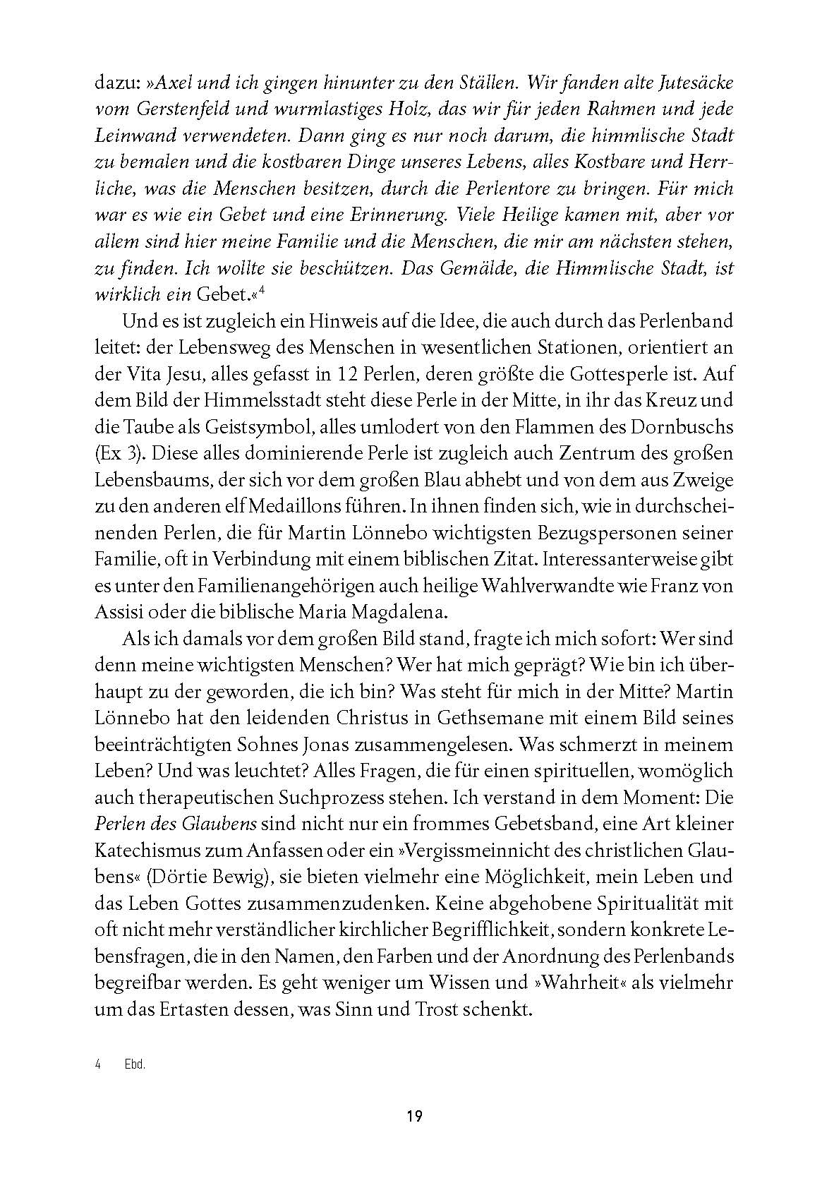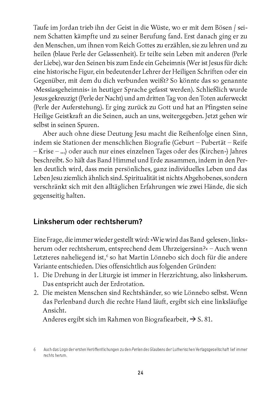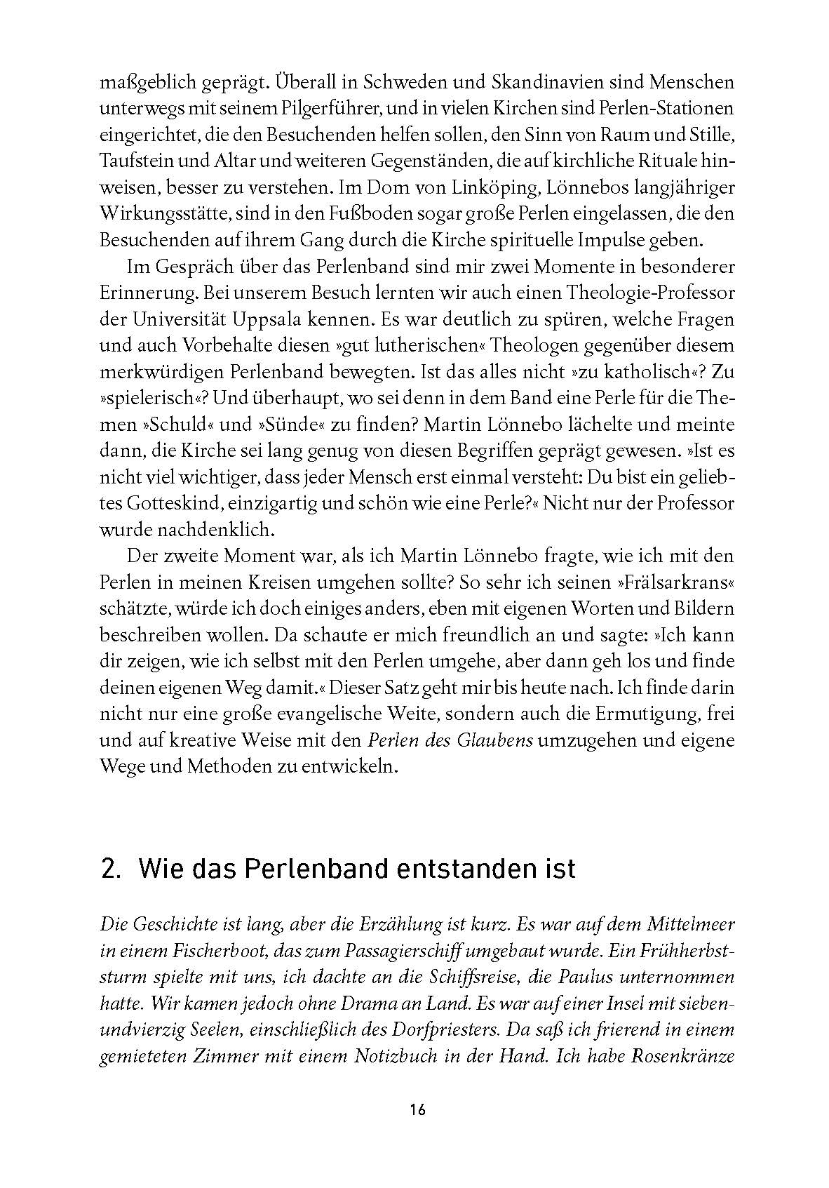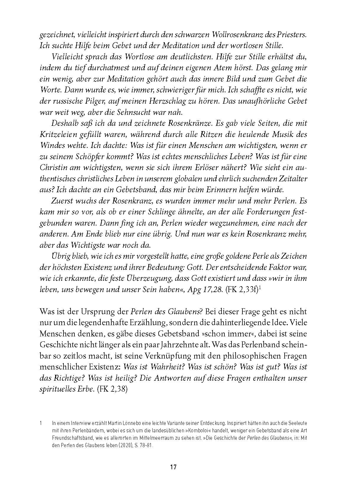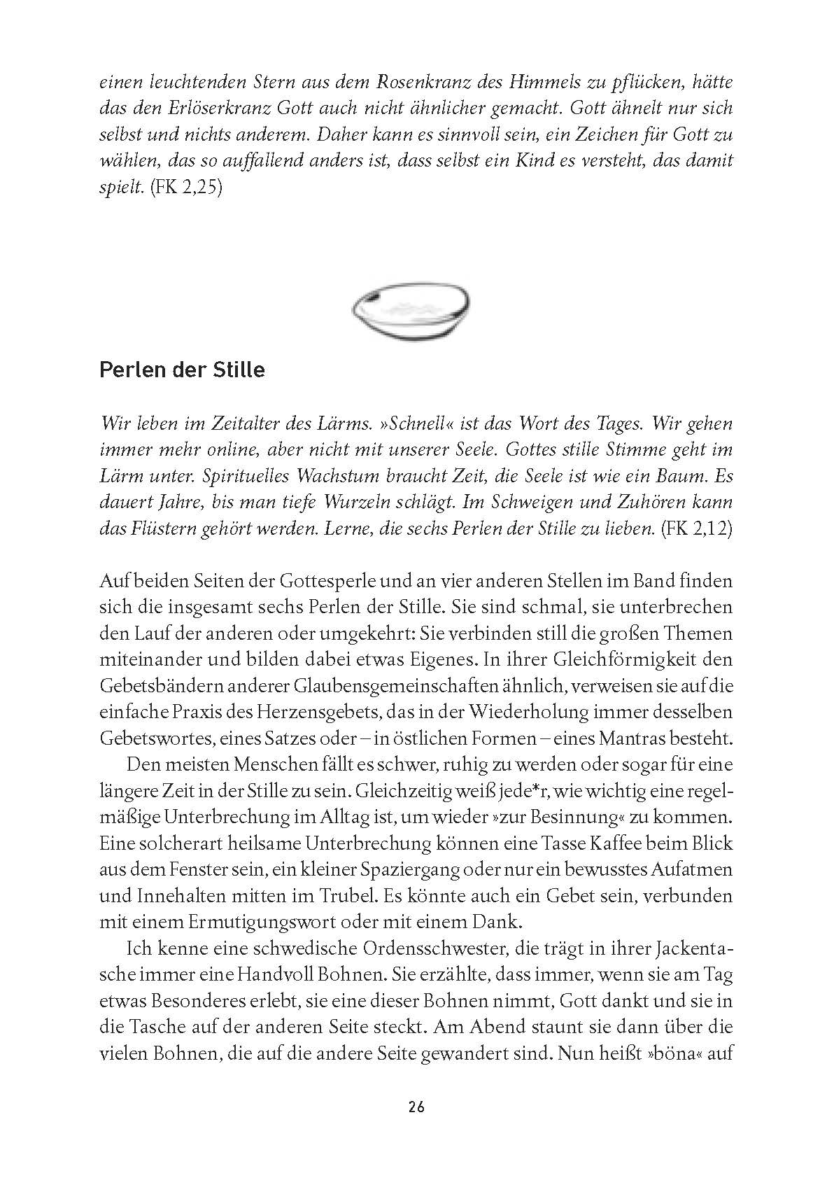 Die „Perlen des Glaubens“ sind ein praxisorientiertes, bildhaftes Konzept: Ein Perlenband als „Katechismus für die Hände“, das spirituelle Grundfragen und Glaubensschritte sichtbar, fühlbar und erfahrbar macht. Jede Perle steht für einen Glaubensaspekt – von der Gottesperle über die Perle der Stille bis zur Perle der Gelassenheit. Dieses Werkbuch erläutert Herkunft, Theologie und praktische Anwendung der Perlen des Glaubens und macht sie zu einem Übungsgerät für die Seele.