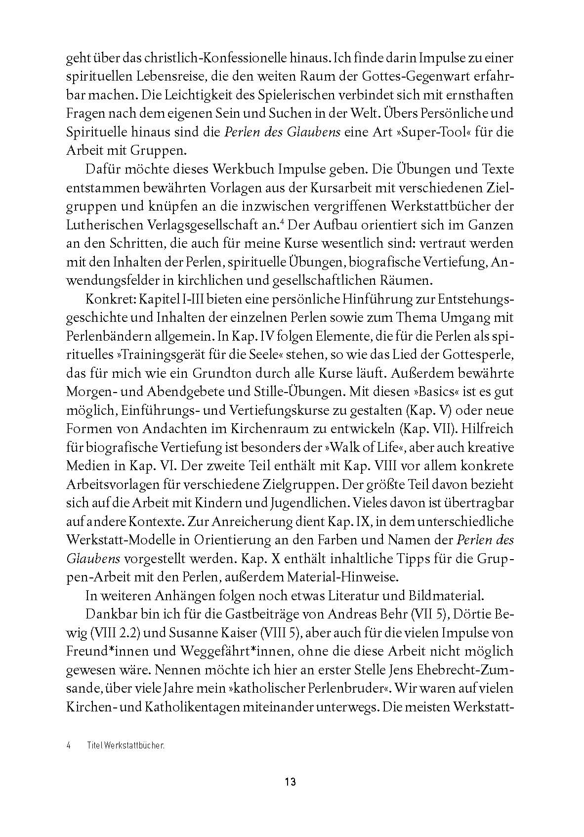 Die Konzepte im Werkbuch sind erprobt in Seminarreihen und Fortbildungen. Hinweise zu Referent:innen, Fortbildungsformaten und dem Netzwerk „Perlen des Glaubens“ erleichtern die Umsetzung vor Ort. Viele Gemeinden nutzen das Material für Inhouse‑Schulungen oder als Fortbildungsbaustein für Ehrenamtliche.