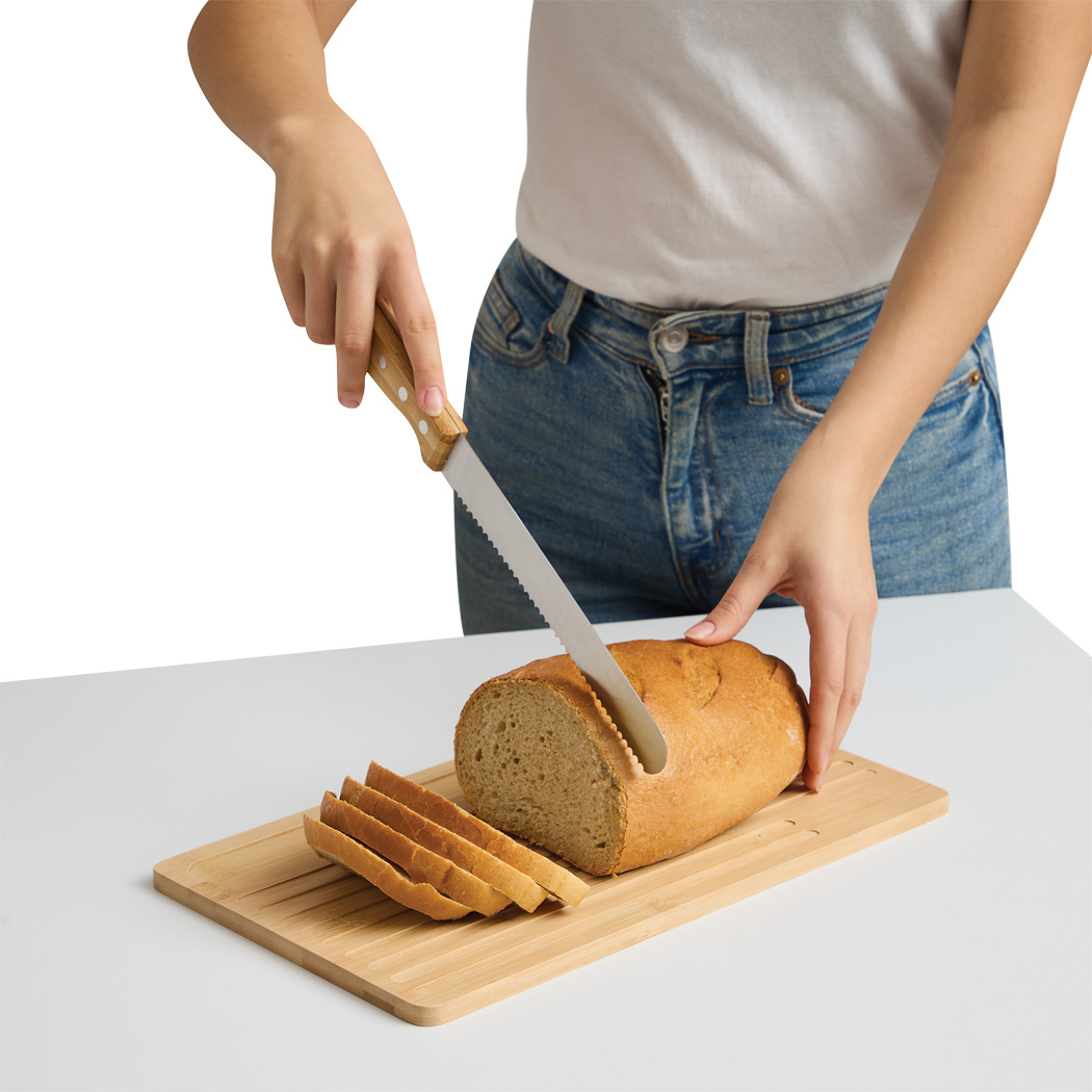 Die spezielle Vertiefung im Schneidebrett für das Messer ist clever durchdacht und verhindert ein Verrutschen des Brotmessers. So ist nicht nur die Sicherheit erhöht, sondern auch die Platzersparnis in der Küche – das Messer verschwindet perfekt in seiner Mulde und ist schnell griffbereit, wenn es gebraucht wird.