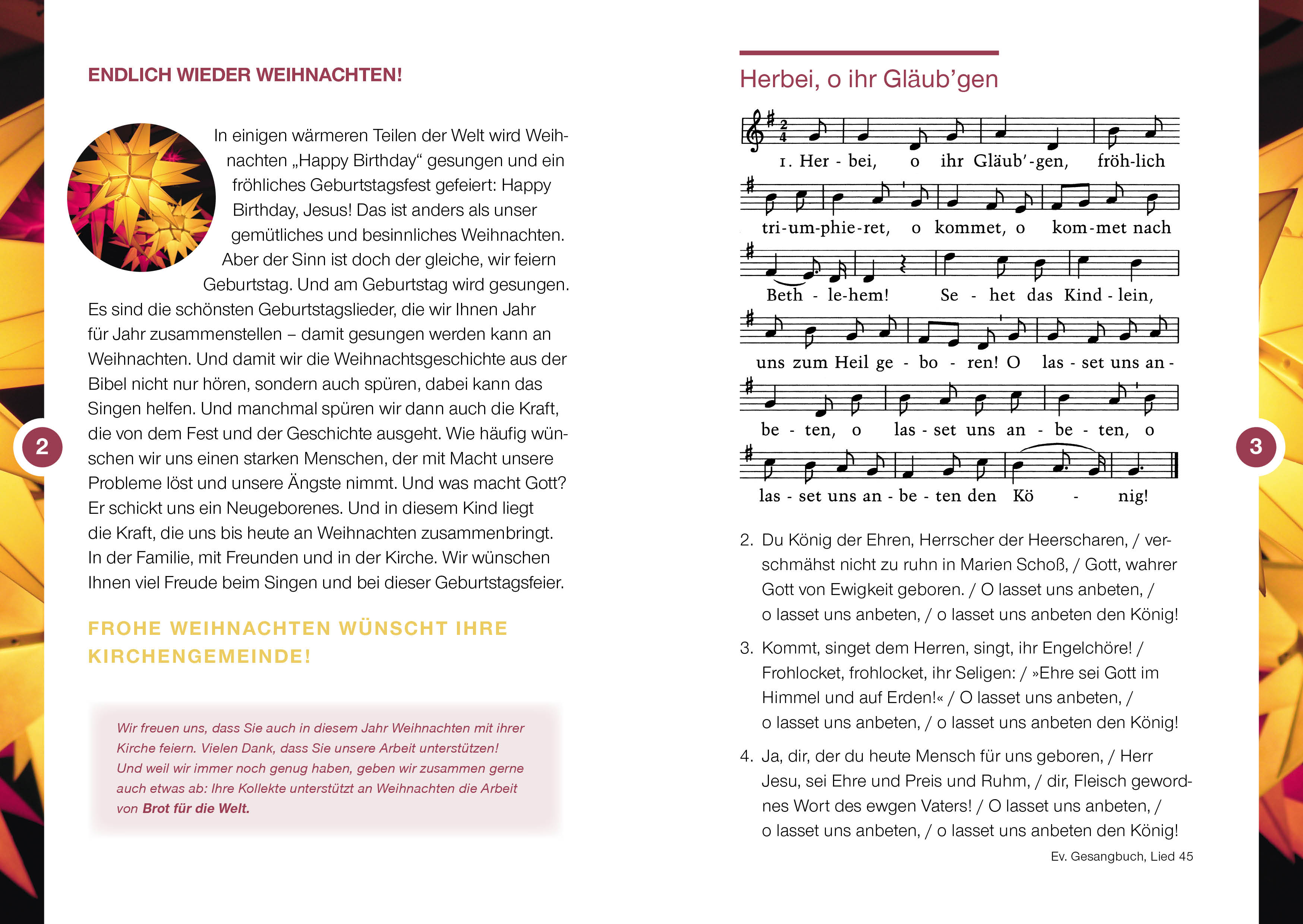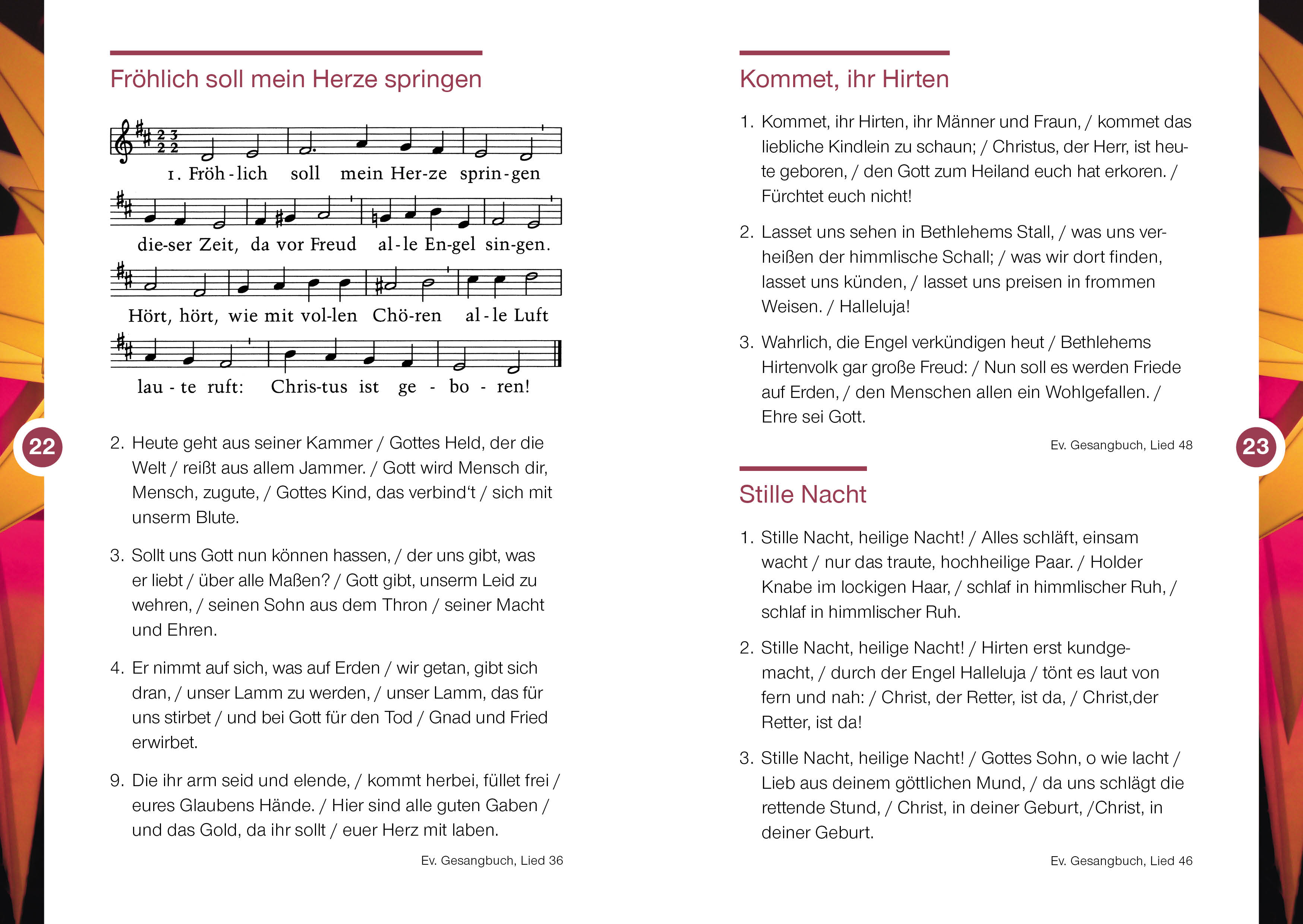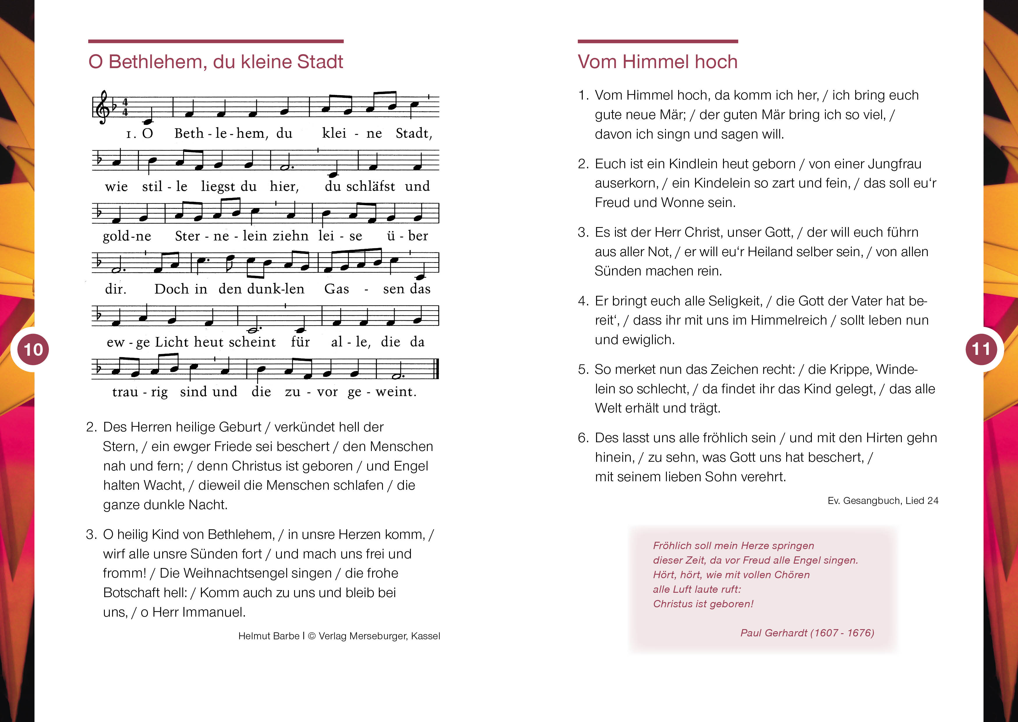 Das Liederheft enthält die bekannten Weihnachtslieder der Weihnachtsgeschichte, Bilder und Texte. Sie können das Heft nicht nur in den Gottesdiensten einsetzen, sondern es ebenso an Gemeinde- oder