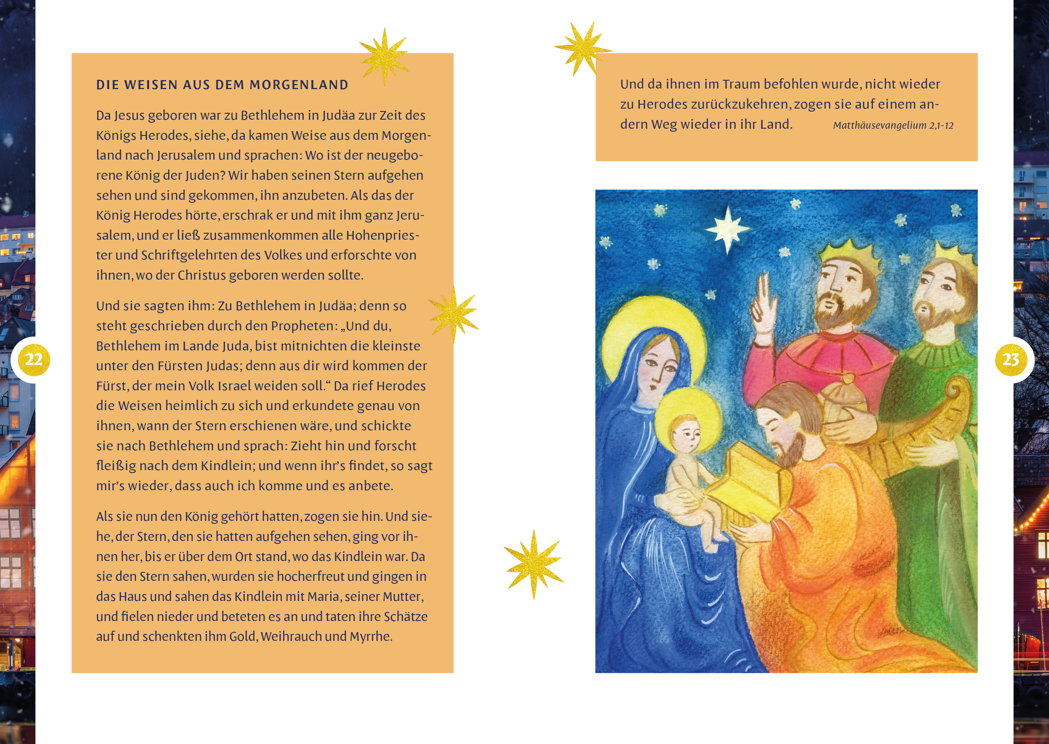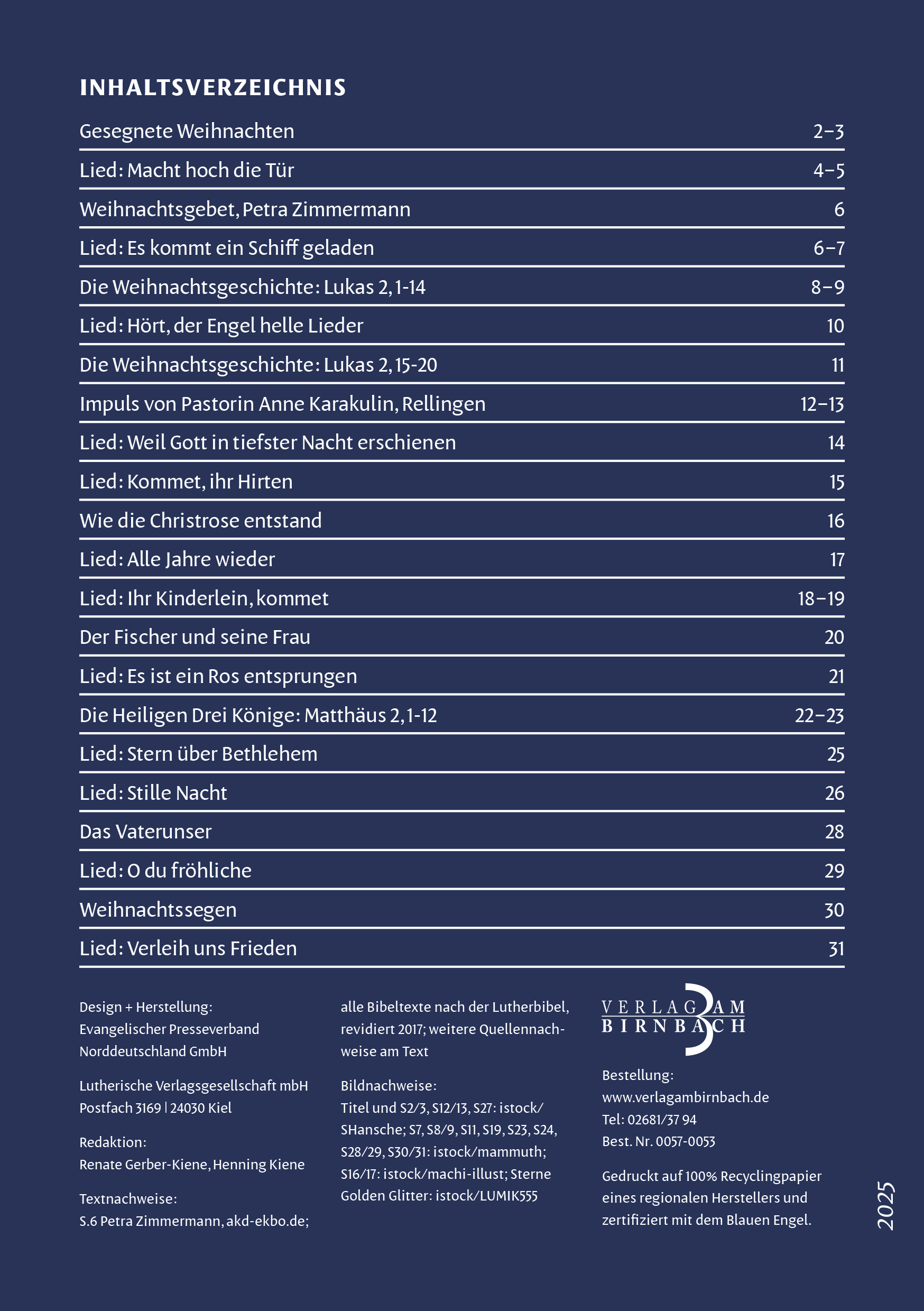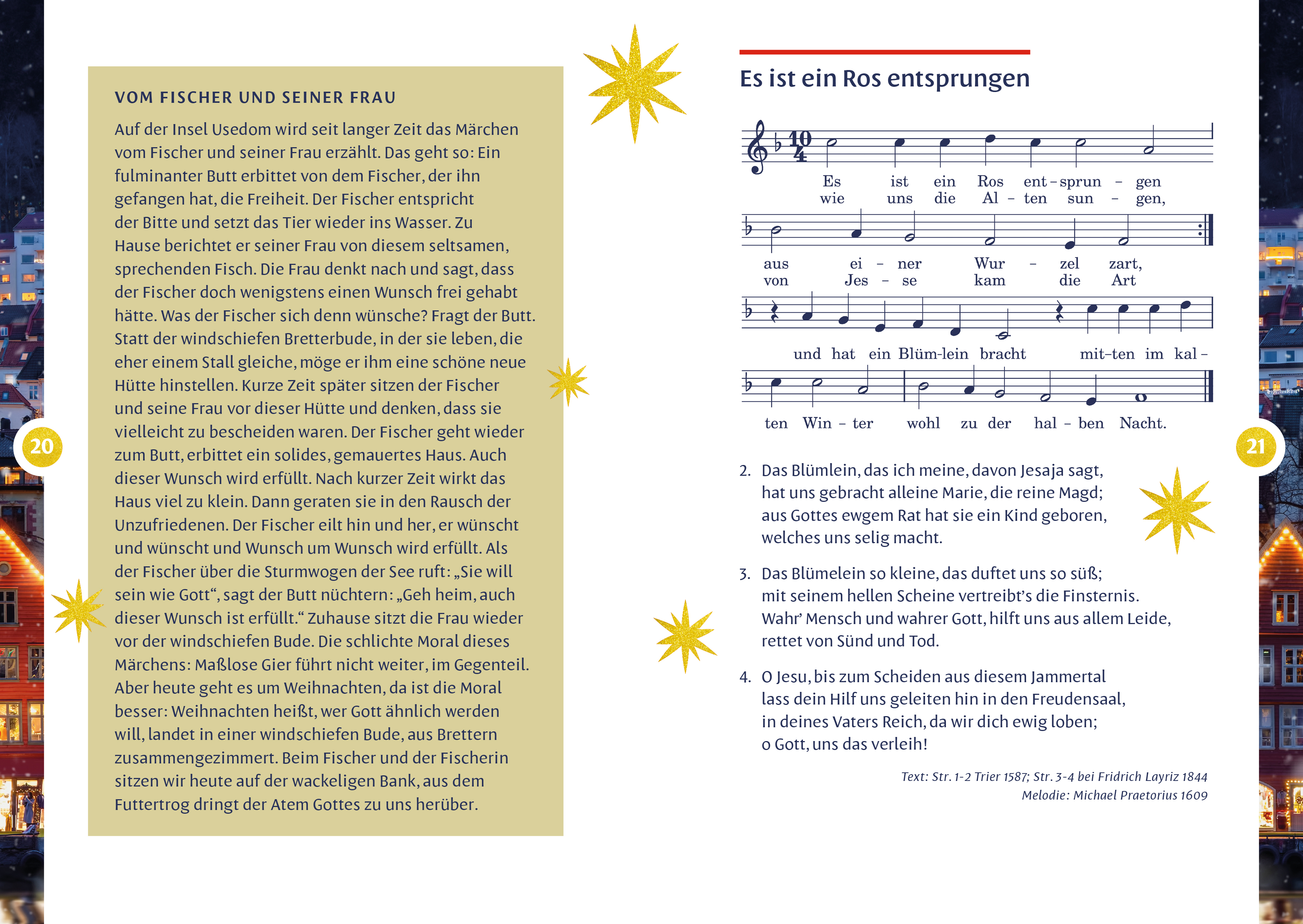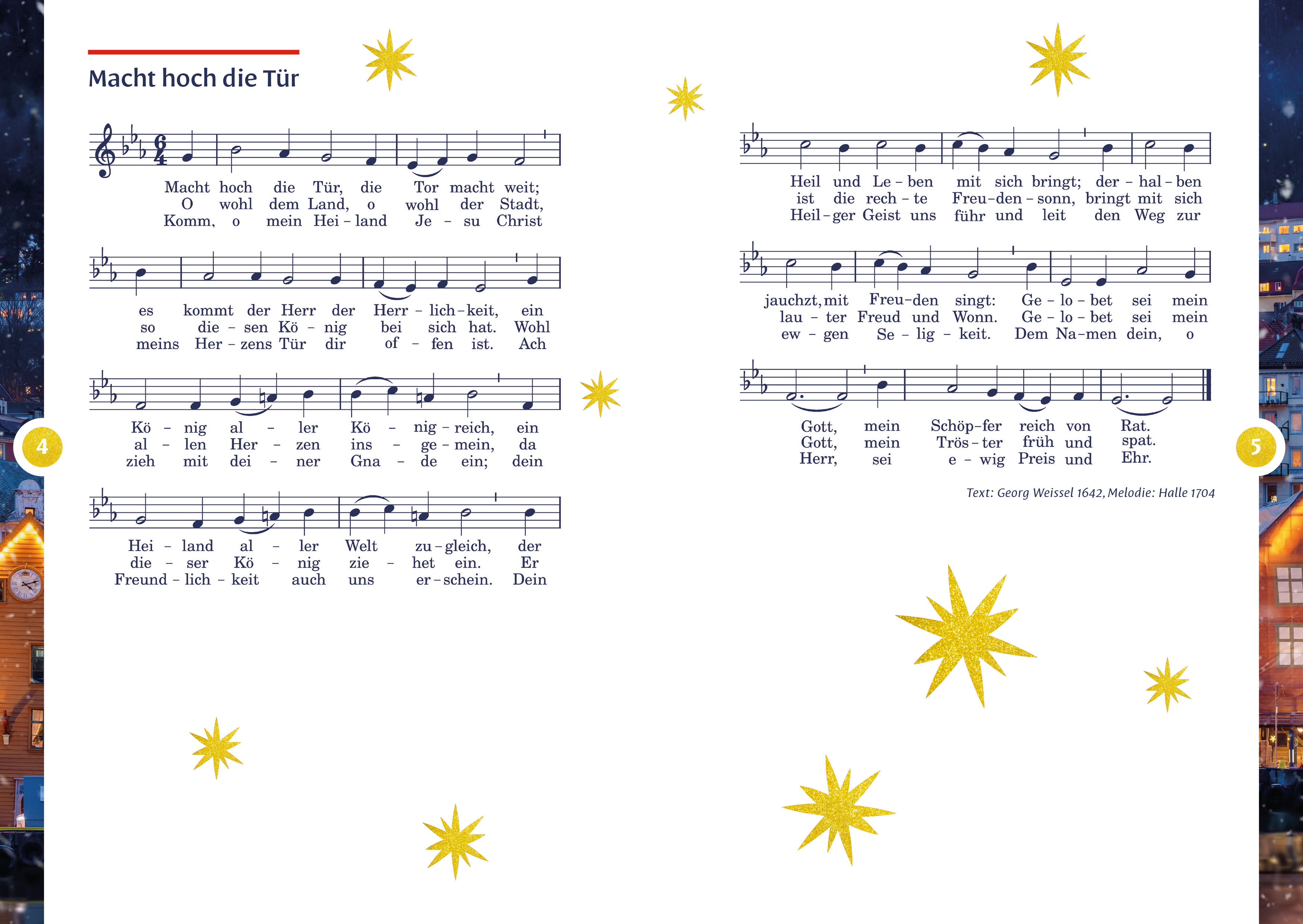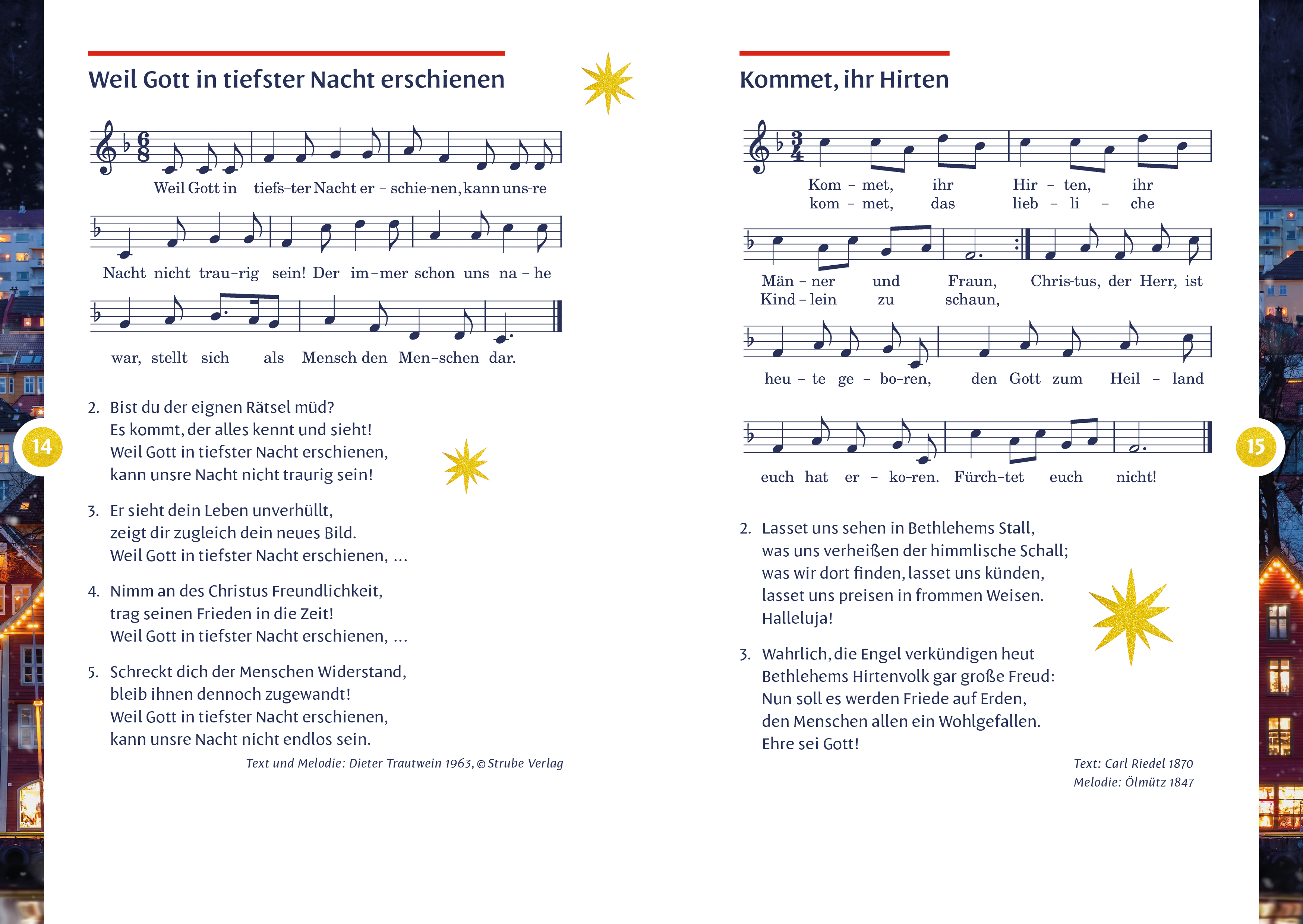 Das Liederheft enthält die bekannten Weihnachtslieder der Weihnachtsgeschichte, Bilder und Texte. Sie können das Heft nicht nur in den Gottesdiensten einsetzen, sondern es ebenso an Gemeinde- oder