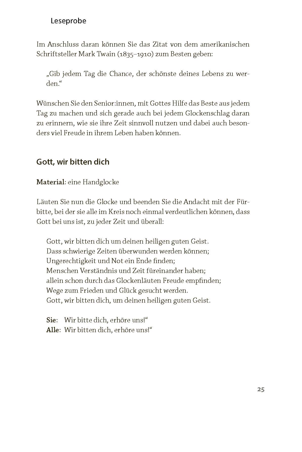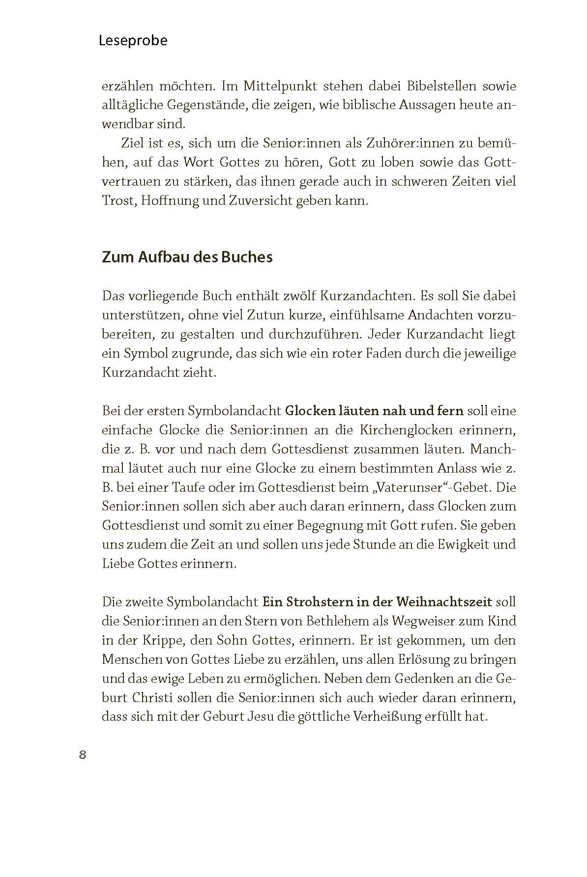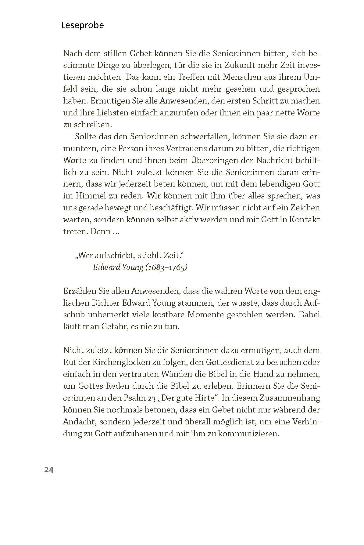 Die Texte eignen sich als Einstieg für Kurzandachten in Klinik, Pflegeeinrichtung oder Hausbesuch – kombiniert mit einem Gebet und einem Segenswort.